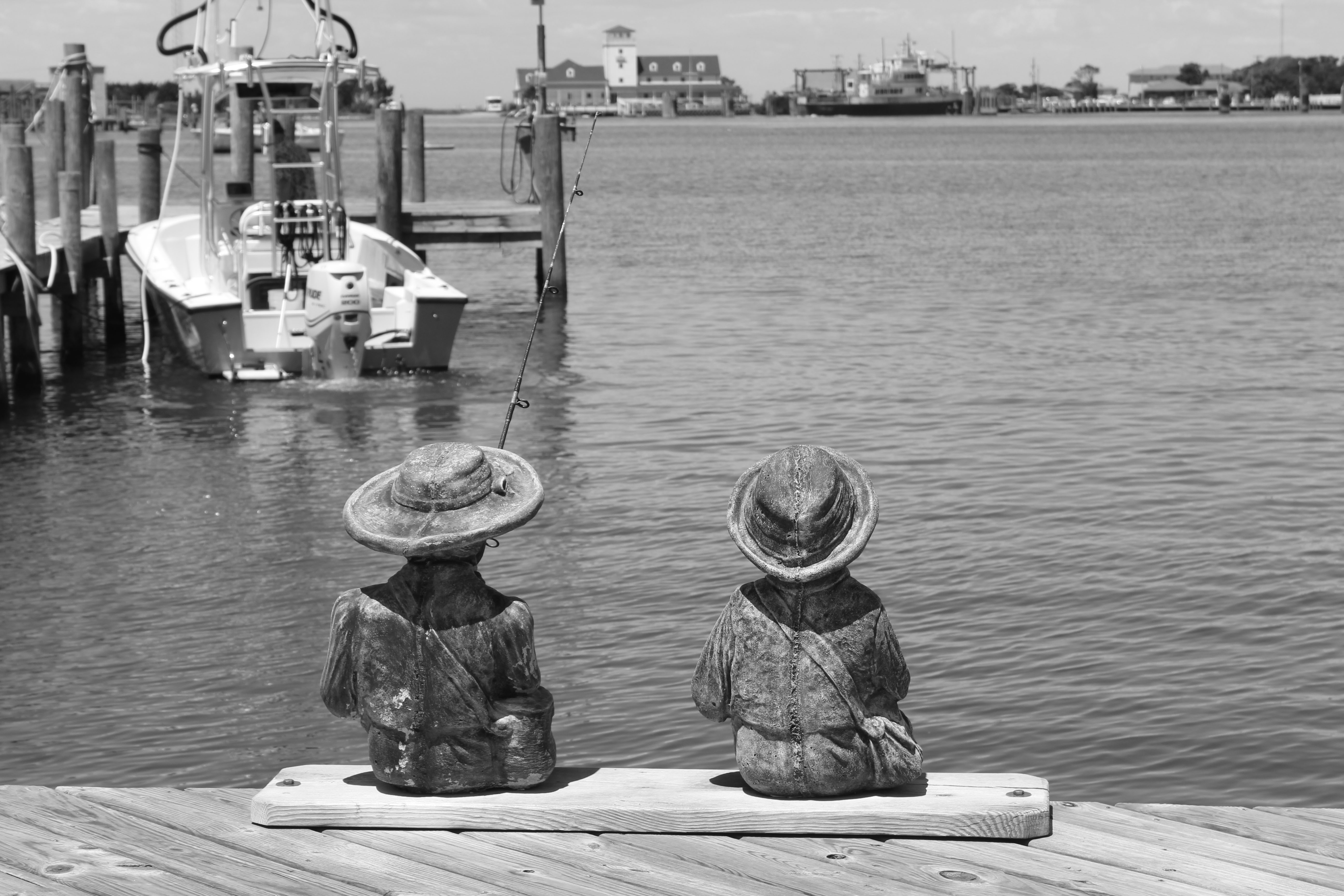 I was challenged to take black and white photo’s for  5 consecutive blog posts for the Black and White Photo challenge.  I would like to nominate Kelly Murray to participate in the challenge.   This week’s picture was taken on the island of Ocracoke.  It was a tough choice but these statues remind me of my mother-in-law’s garden and I love how the boats in the background are slightly blurred.