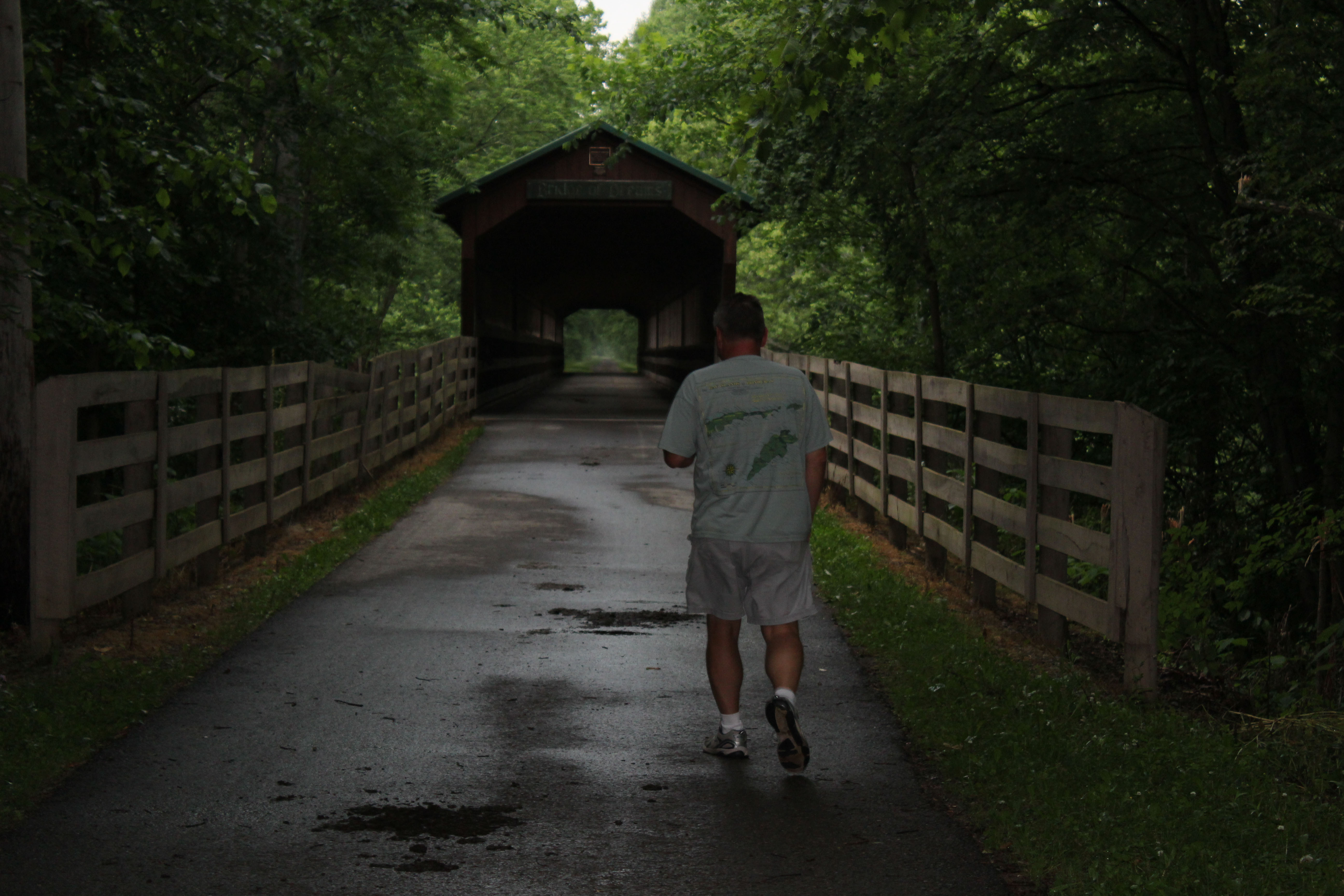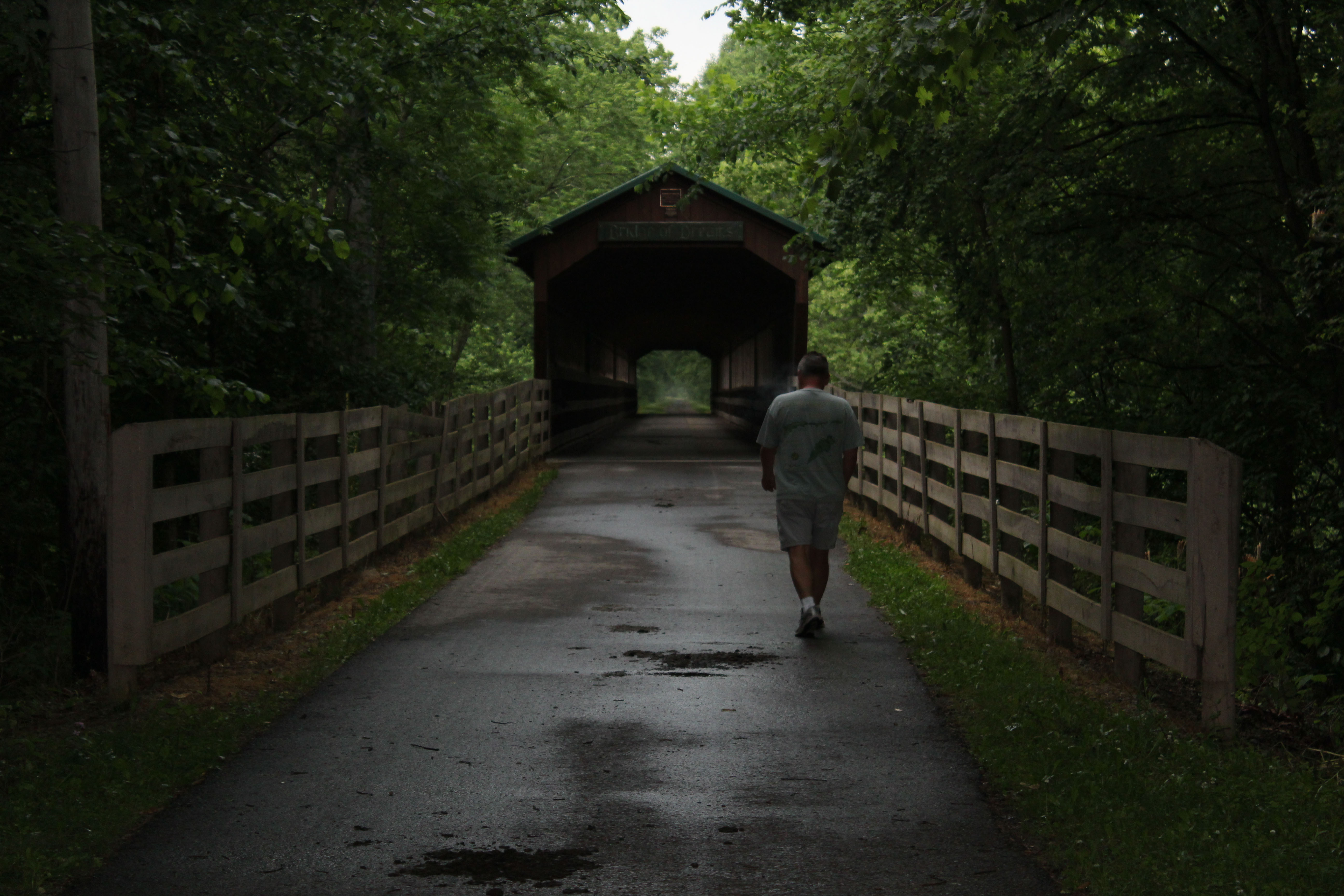 I do want to mention that if you are traveling through Amish country (especially with an RV) you need to be extremely careful.  Horse and buggies ALWAYS have the right of way and you should be particularly careful of curves and rainy days.  Remember this is the only mode of transportation they have and generally must use the main roads to get from place to place.  There was an effort though to build a special roadway ( The Mohican Valley Trail)  and Denny stopped so I could take some pictures of the Dreamers Bridge. You can bike on this trail, but watch our for the horse poop as the Amish use it frequently.