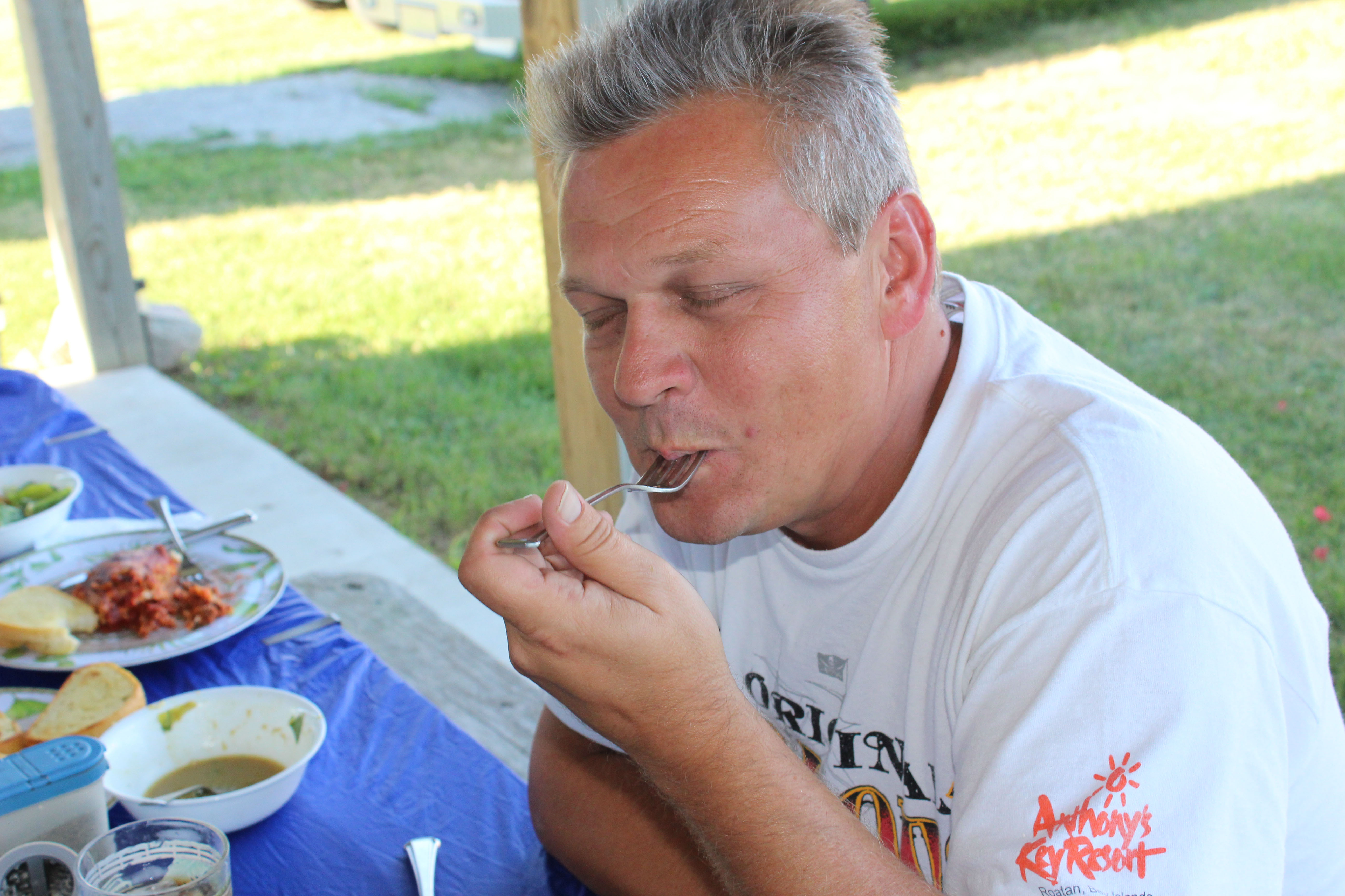 The first item up for discussion was food, and since they both love lasagna and Linda bakes a great one, she volunteered. It is not an insignificant amount of effort and she taught me how to make a lasagna, which believe it or not I have never done before, and I was really grateful. I have included her lasagna recipe below. Next we discovered Howard loves Caesar salad and since Lee’s first job as a kid was making Caesars from scratch table side at a restaurant, we decided to have him make Caesars for everyone. (That wasn’t my first job, it was my second job. My first job was busboy at the fabulous West Wind Steakhouse, at which I met Tracy and decided to marry her. I then waited seven damn years for her to get her act together. It’s also the first job I was ever fired from, because I was so giddy to be around her all the time at the tender age of 14 that the manager decided I was drunk from finishing off leftover drinks, which I was not. Anyone who knows me knows I don’t drink after other people, not even my own wife or kids. It’s gross. – Lee) This left me with little to do but the bread, and I was OK with that. Howard requested German Chocolate Cake and Lee of course wanted pie. Unfortunately I am not much of a baker, but Linda recommended a little bakery around the corner and they could make a dutch apple, which is Lee’s favorite. It was $15 for the pie, on the high side, but since he is not getting a drone (liked he wanted) for his birthday seemed a small price to pay. (This is why I am not into birthdays, by the way. I asked for a drone, and what I got was a pie, and being forced to work like some kind of indentured servant. If, by the way, you are reading this and have an extra $1000 you need to get rid of, just click here. – Lee) I did feel guilty though about how little I was contributing and decided to spend my lunch break picking raspberries. This is another thing I have never done and thankfully Carol, the super nice camp host here at The Pines , loaned me her hat netting. Picking raspberries is a ton of work and crazy buggy. They were yummy and went well with the cake and pie, but not sure its something I would want to do on a regular basis. (She lies. Putting raspberries on a Dutch apple pie is an abomination. Don’t do it. Think of the children. – Lee)