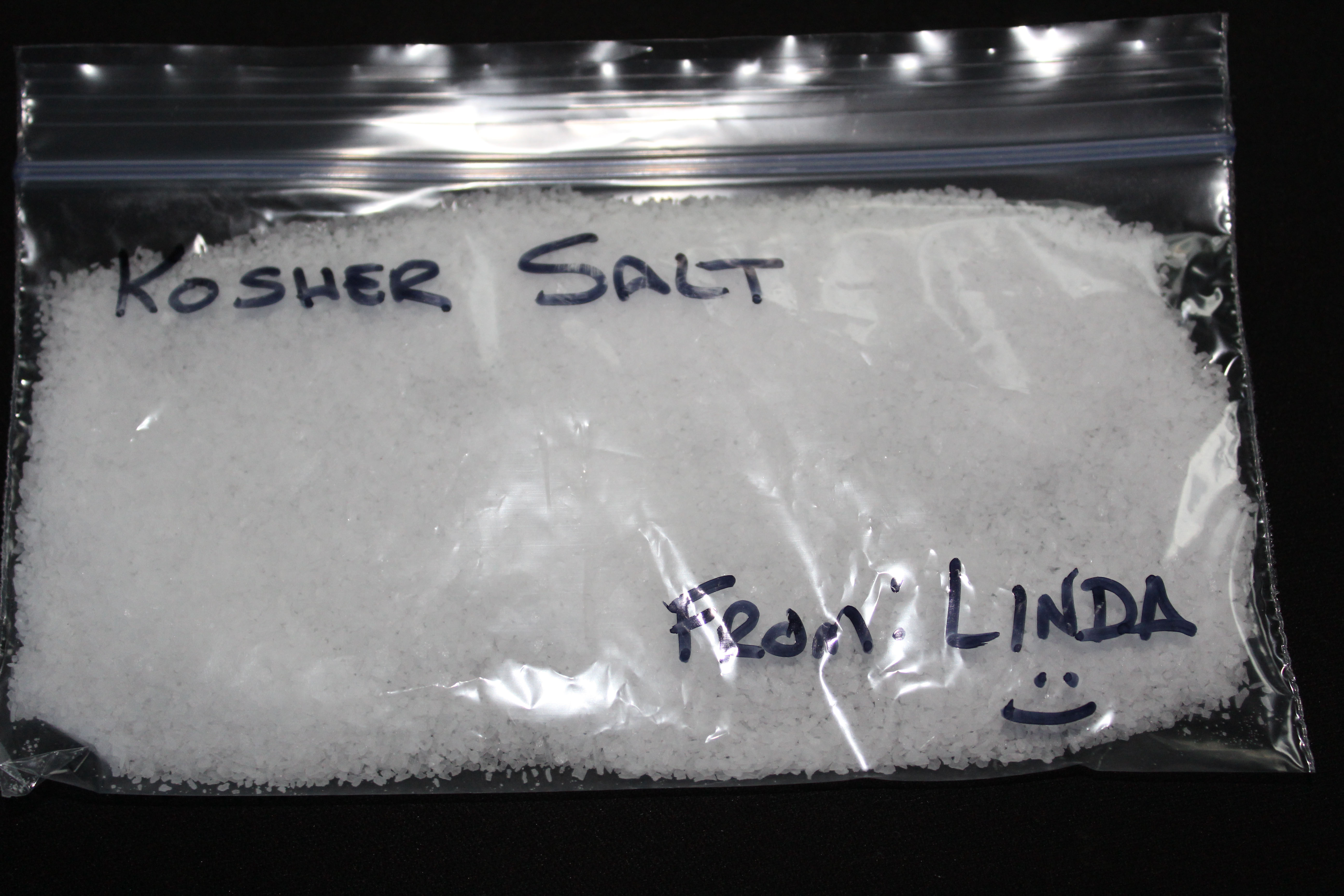 Linda gave me some kosher salt when I mentioned I didn’t have any. Love the smiley face on the bag !!