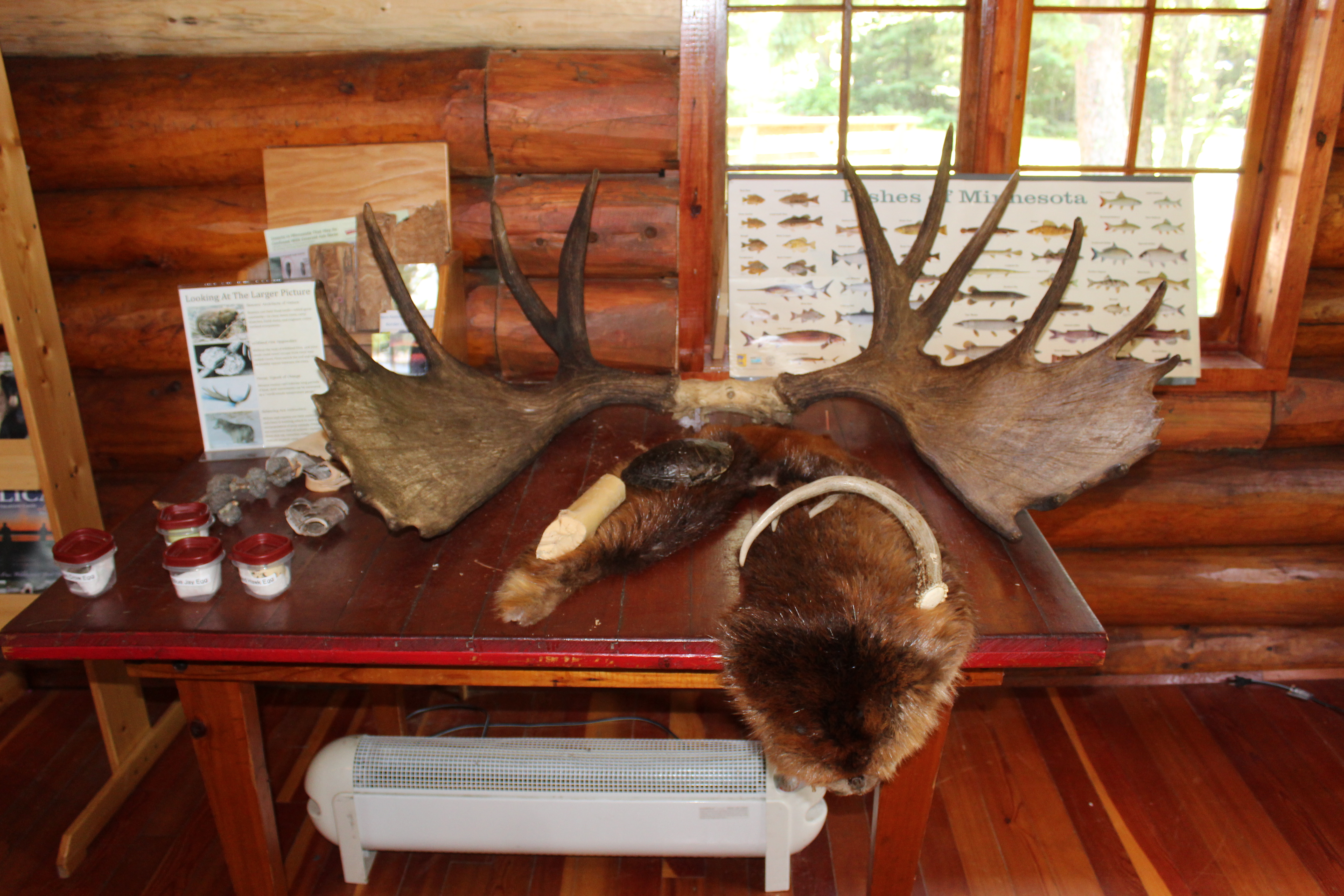 Then we moved on to the Ash River Visitors Center. It was very nice, but I have to say I like the Lake Kabetogama center better. It did have a cool table though with a beaver pelt, moose antlers and a deer antler that people could touch, which I appreciated. Plus when you walked out back it had a nice view of the lake. We didn’t spend much time there but touching the moose antlers made the stop worth it. I get excited about all kinds of things…OK, I am picturing what Greg would say to that, but you know what I mean. It doesn’t take much to make me happy which is a pretty terrific way to live, I recommend trying it!