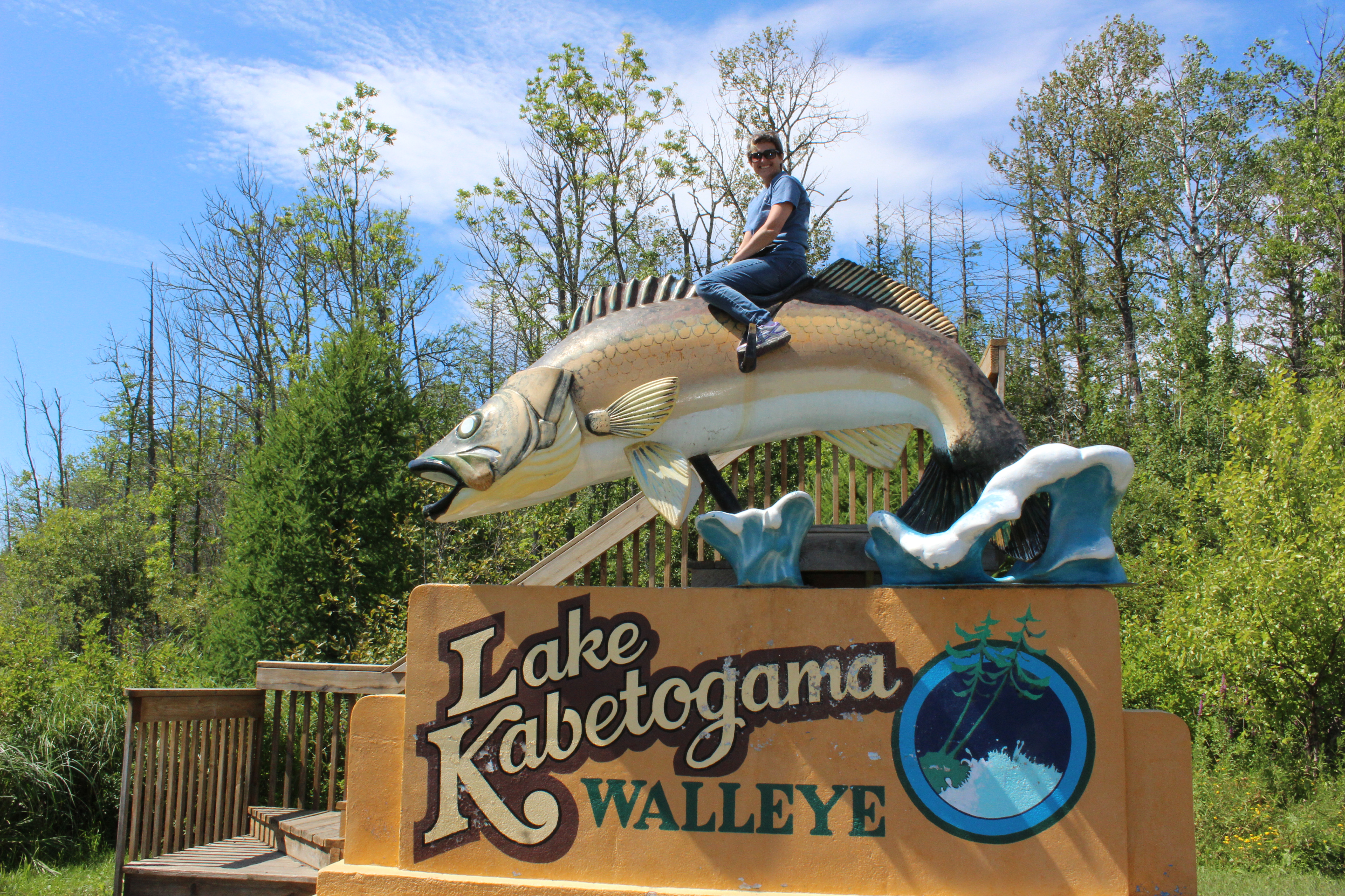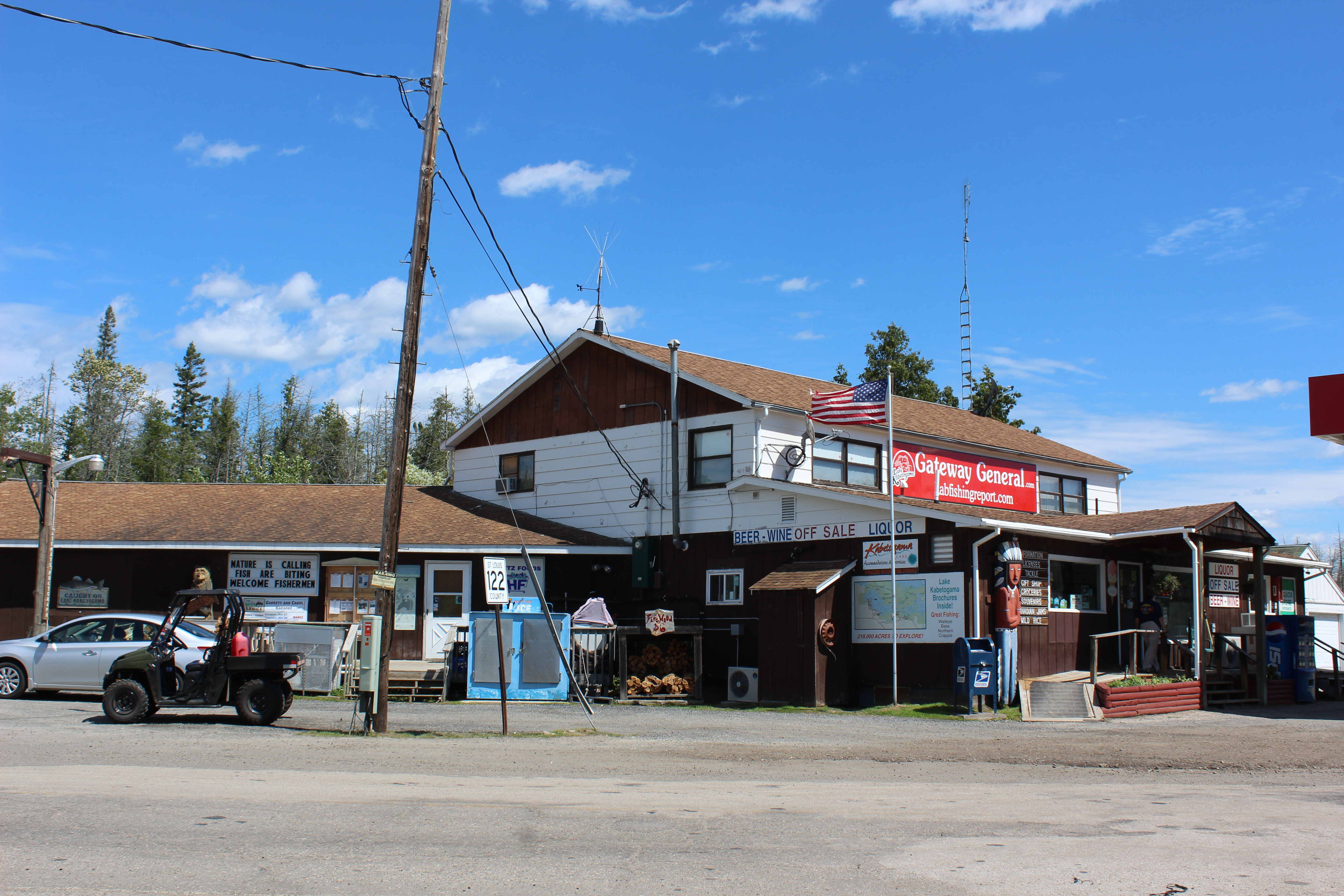 On the way back to the campground we saw a sign for NOvA, a physics laboratory sponsored by the University of Minnesota. In the spirit of our new lifestyle we made the turn and drove several miles down an isolated road until it reached a dead end at a large secured compound. It felt like we stumbled upon a secret lab (OK, not so secret; they do tours on Thursdays) but still it was cool. According to The University of Minnesota website, “The completed section of the detector is about 12 feet long, 15 feet wide and 20 feet tall. It catches cosmic rays – particles produced by a constant rain of atomic nuclei falling on the Earth’s atmosphere from space – at a rate of 3,000 rays per second. When cosmic rays pass through the NOvA detector, they leave straight tracks and deposit well-known amounts of energy” I have absolutely no idea what it is all about but “the $283 million NOvA experiment involves 169 scientists and engineers from 34 global universities and laboratories” and “when the detector…is completed, physicists will use it to explore the mysterious behavior of neutrinos, fundamental building blocks of matter that are thought to have originated in the Big Bang. Way cool. So in order to celebrate this discovery what else can you do but stop and take a picture with a big fish? We have passed this sign numerous times but never stopped and I couldn’t pass an opportunity to ride on the fish and get my picture taken. Plus, it’s across the road from my favorite little convenient store Gateway General . I really like this store because it has a little bit of everything, and yes, the prices are high, but not so high that you feel guilty for not driving the 30 minutes into Littlefork, Orr, or International Falls. Plus the people who work their are super nice.