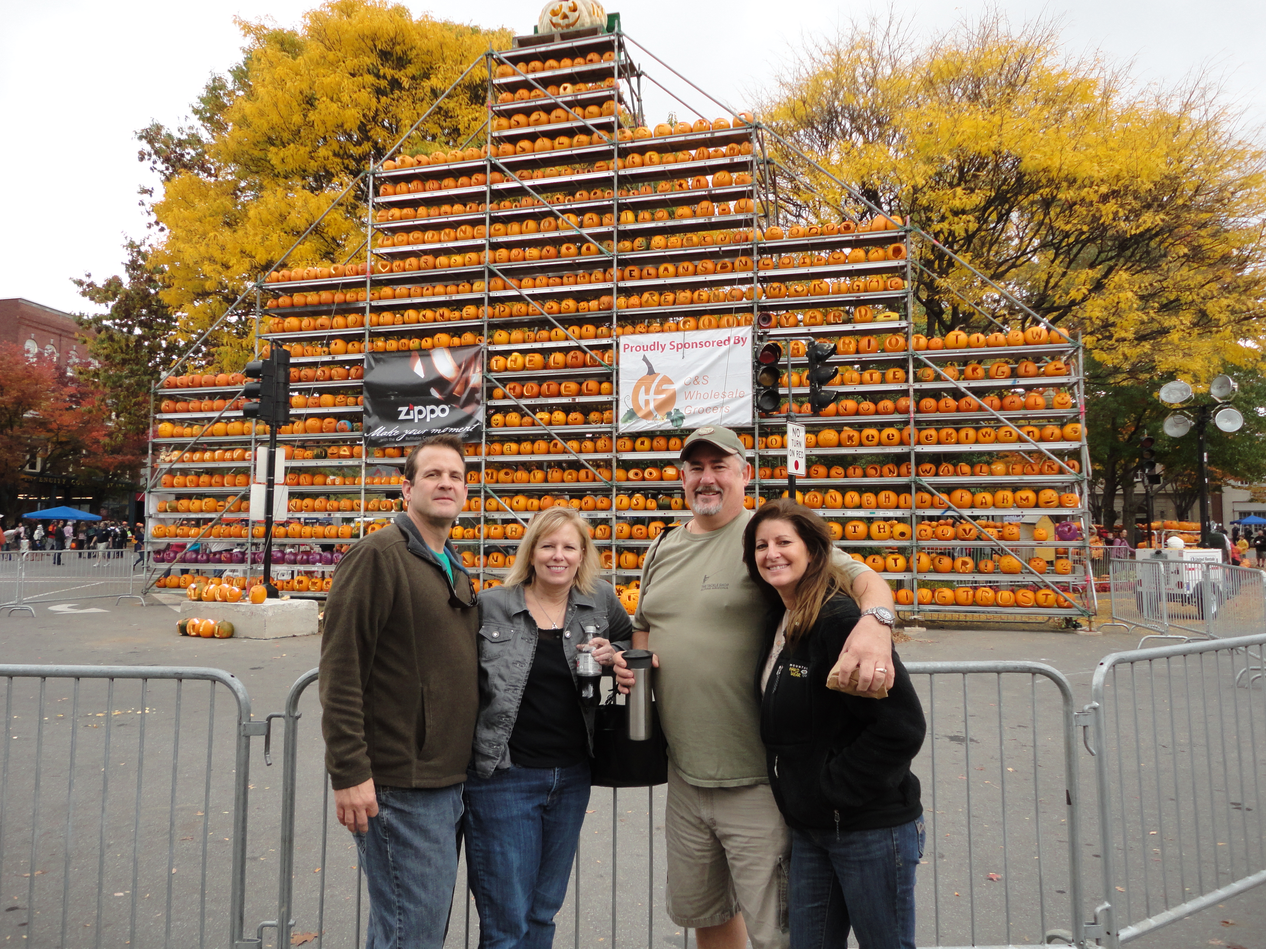 Greg, Cori, Steve, and Deb in front of the large pumpkin tower