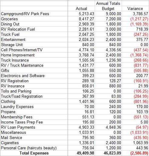 Well, here we are at the end of 2015 with our very first annual financial summary.  Although we did some research when we started, many of our budget categories were wild guesses and I was so pleased by how many were at least close to our projected numbers.  I can’t stress enough that the costs in Year One will probably be higher than in subsequent years, but it is also fair to say that we were trying to be careful with our money.  Our operating costs were $49,409.98 and many of our friends who were out the first year were also spending about $4K a month.  (This summary does not include all of the one-time expenditures, for more information on that please see the First Year By the Numbers post.)  Let’s put that into context; we were living on more than twice as much when we were in a sticks and bricks, and more importantly, as soon as money came in it went right back out again.  What matter the most to me is that we landed only $2,590 over our estimated budget for the year, which is awesome, and frankly somewhat miraculous.  The great thing about Year 1 for us was I still had my corporate job so that gave us tons of breathing room.  Year 2 will be much leaner as we rely on the income we can make on the road.  Our stance next year will be putting money in and taking money out of our $30,000 in savings.  If we spend down to $10K we will have to stop and get serious about making money for awhile, but it feels great knowing we have easy access to 6 months worth of costs. This lifestyle for us is an adventure and many other wonderful things, but it is also an experiment.  Can two people with good health and good skills make enough money on the road to cover their costs AND continue to live a life full of enrichment?  Next year will be the real test without a guaranteed source of income, but I feel so much better about the probability of our success after seeing these numbers.  So let’s dive in!