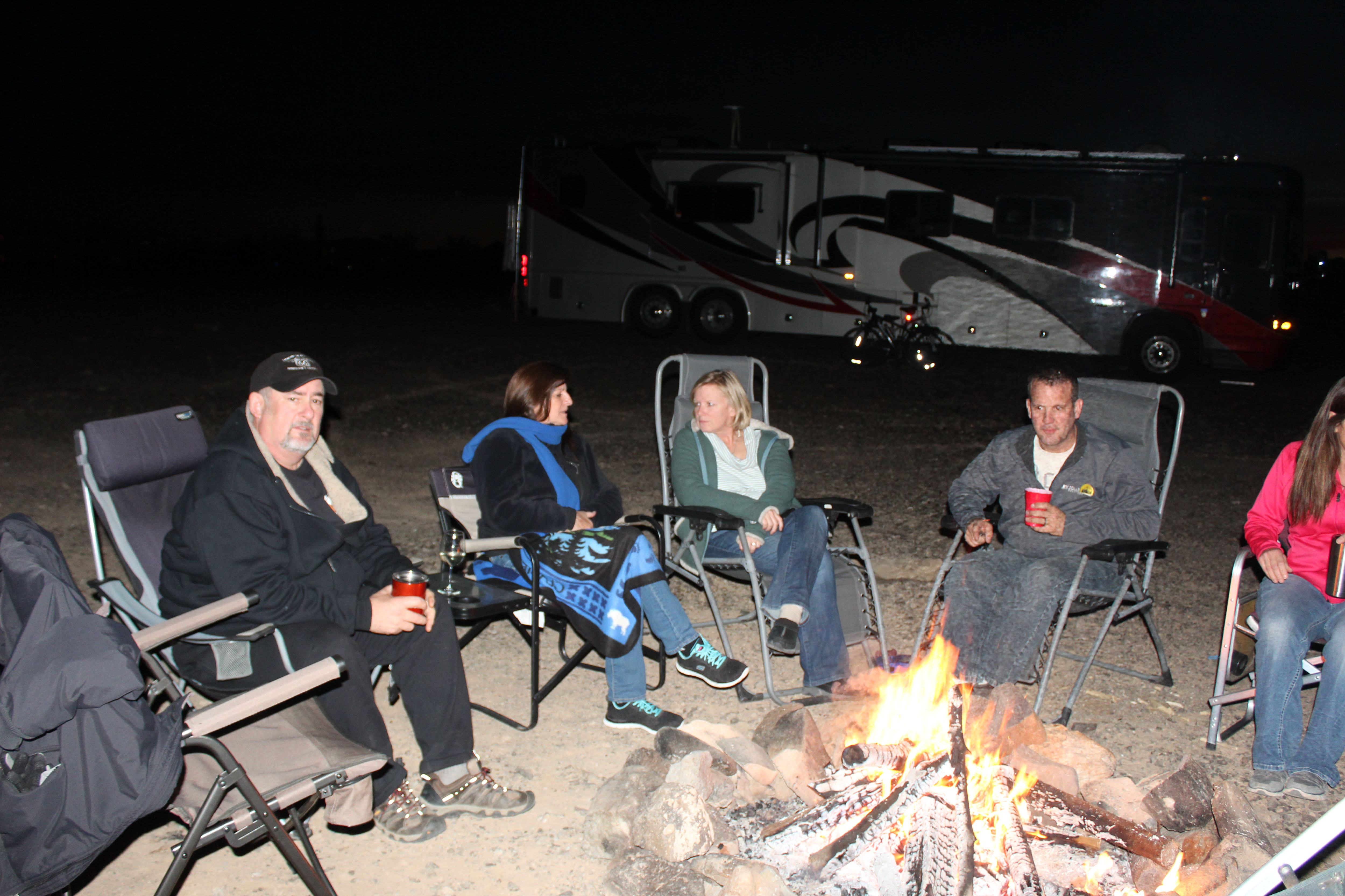 Then Cori and Greg, fellow 2014ers, finally arrived. They drove up from Texas and ended up getting in early so Deb and I drove up to the front to escort them back. We paid Pam and Red’s kindness forward, by helping Cori and Greg get acclimated. Greg owns RV Solar Solutions so we knew he would be fine on generating power, but there was still the trash and tank management to talk about. They are in a really nice Class A that has macerating toilets, but they also use a pre-specified amount of water to flush, so black tank management is always a challenge for them. One of the benefits of a Class A though is you can always just drive over to the dump station, so we will see how that all plays out for them as the weeks go on. We were all really excited to see them, because even though Cori and I chat/text at least every other day I hadn’t physically seen them in a year and thankfully they arrived on Lee’s one day off this week so we all got to have a campfire and hang out together. Then we went over to the Xcapers happy hour and got to meet Chris and Cherie from Technomadia and Travis and Melanie who have founded Xscapers. I have been wanting to meet Chris and Cherie since we started full-timing and they were of course very nice. I was happy to have an opportunity to thank her for her words of wisdom in the forum and on her blog and the fact that they have been an inspiration to us in becoming full timers. Travis and Melanie were really great. They have a 4-year-old and Melanie is pregnant with their second child and they work full-time for the Escapees organization. They have started a sub group for those of us who are mobile workers and are working very hard to provide resources for those folks who are working on the road. I am very excited about this because we really need resources for us working RVers and since Escapees is such a huge RVing community they should have the resources to really get things started. Lee and I spoke to them for about 15 minutes and I was very impressed by their vision, plus they are just cool people to hang out with. Can’t wait to see what they come up with this year.