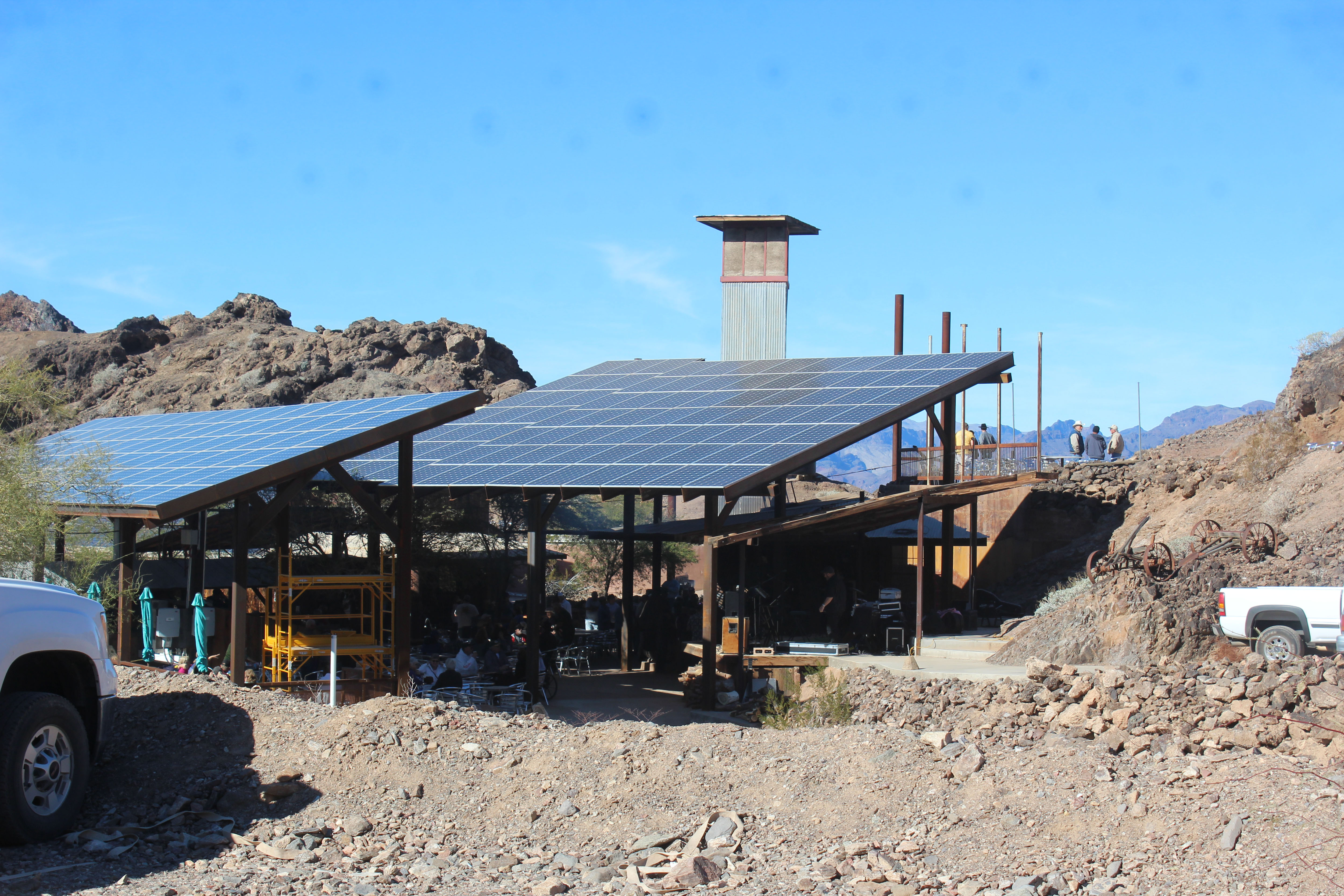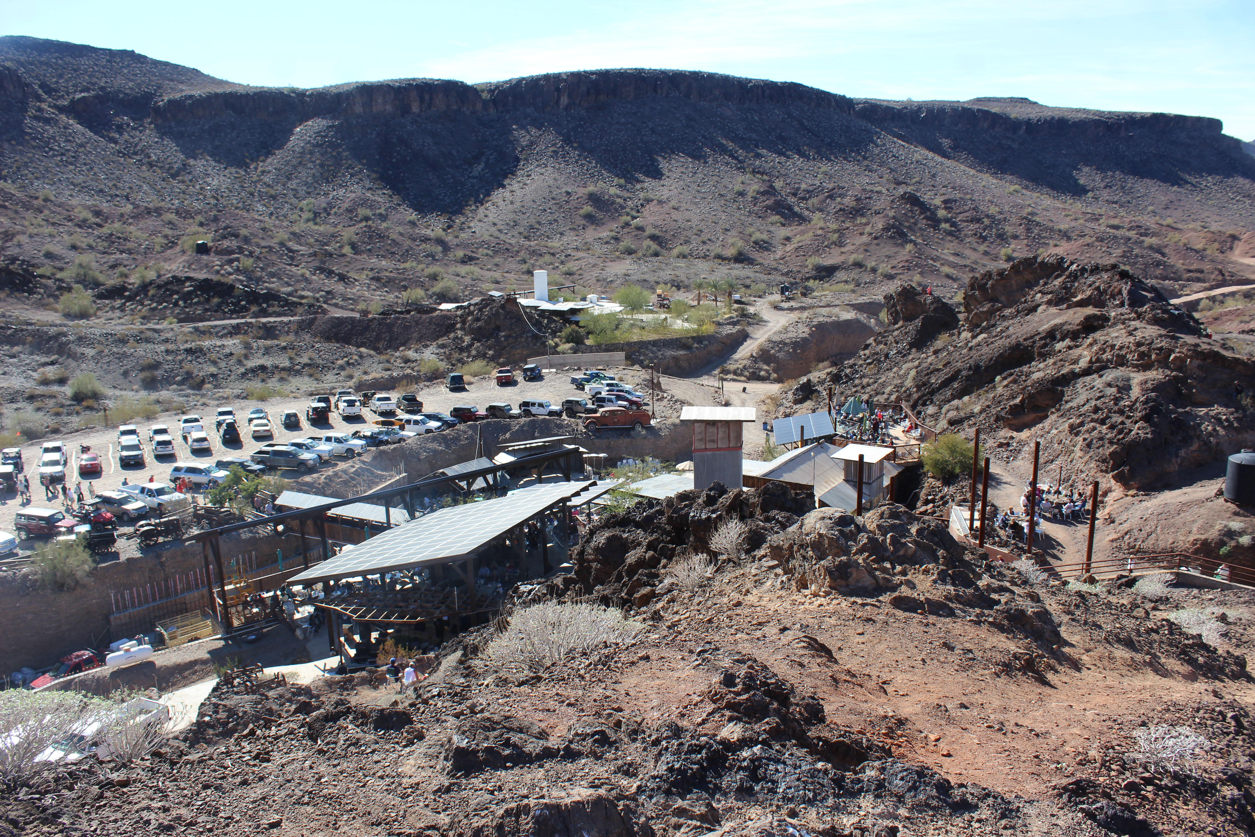 On Sunday, we decided to go to the Desert Bar. This bar is out in the middle of no where, 6 miles down a very rocky road off the highway past Parker. You can’t go to Quartzsite though and not go at least once so Deb, Steve, Cori, Greg, and I all went. The story is that in 1983, Ken the owner bought an old copper mine and decided to give a bar in the desert a try. It has since grown and expanded and the place was busy when we got there at noon and even busier when we left. We took some pictures, ate a decent but expensive lunch, and listened to the band. It’s not something I would do regularly, but it is a very neat concept and truly is in the middle of no where. Also it’s a cash only place so bring extra, because you’ll probably want to get a T-Shirt.