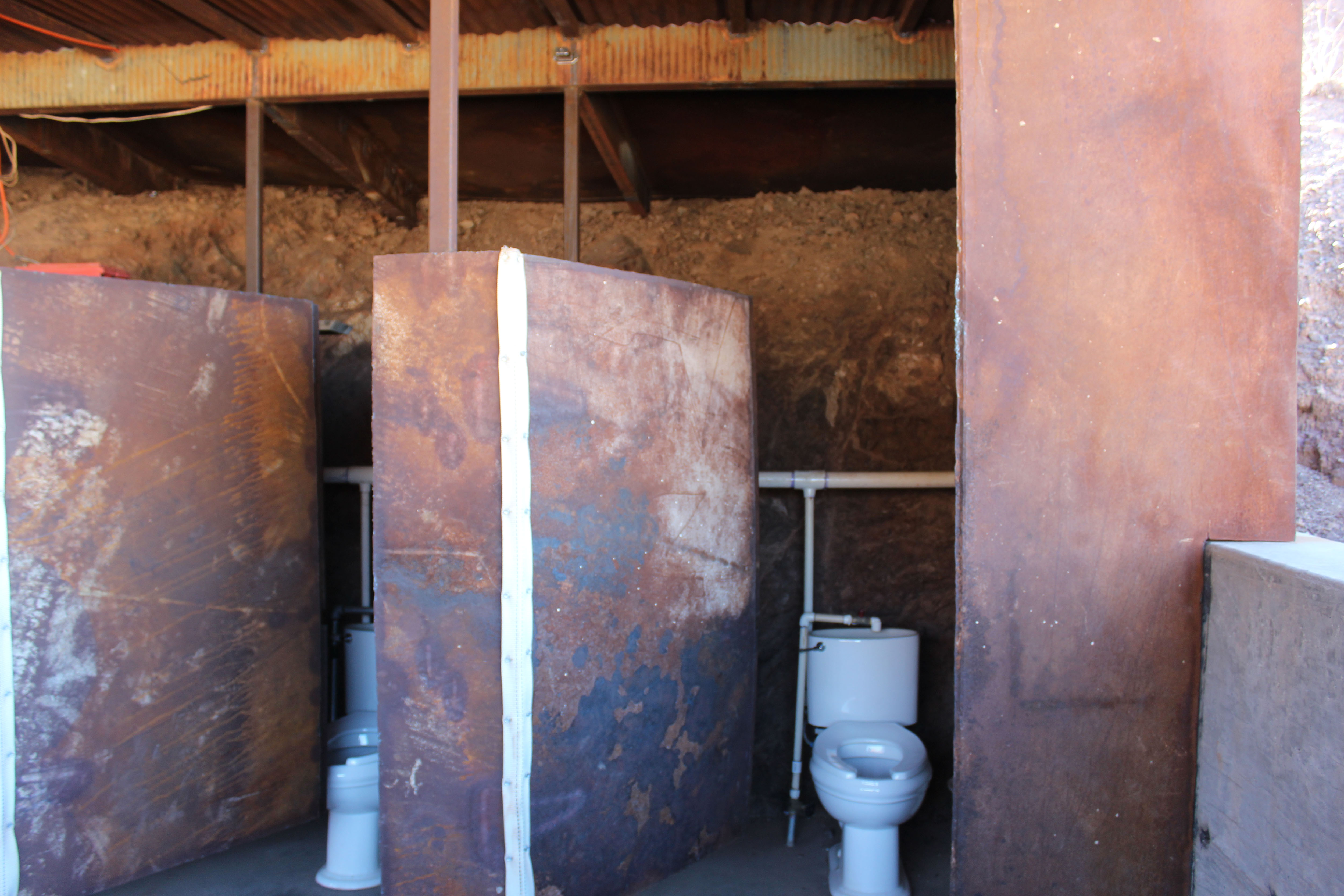 The wall behind the stalls was packed dirt which was cooler than the picture suggests. The doors are metal sheets.