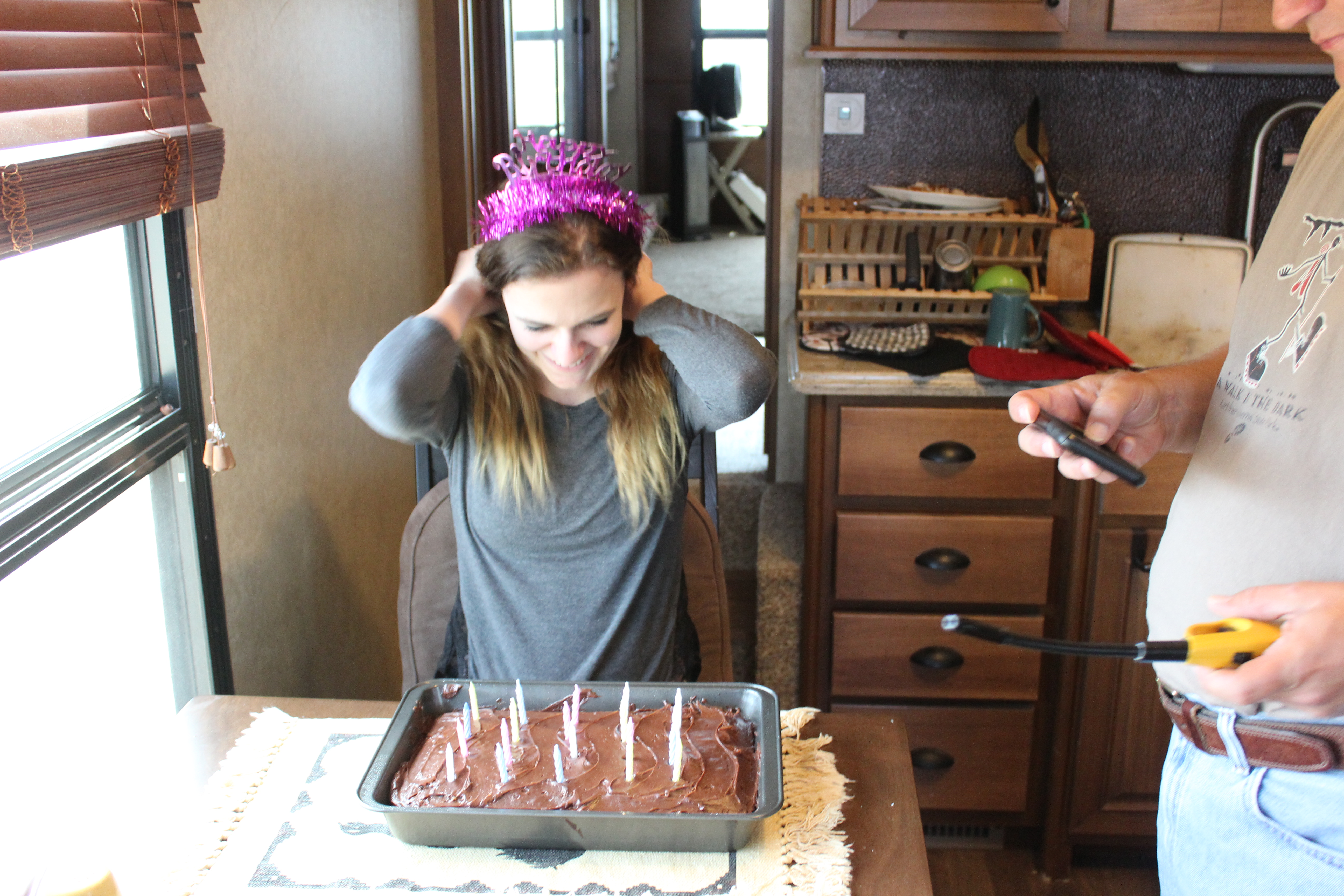 As I’ve stated before I don’t believe in coincidence, so when Kay’s route between her Air Force school in Monterrey (she passed her Korean course with honors) and her next duty station at the Goodfellow Base in  Texas took her right through Albuquerque it felt meant to be.  When she made it to Albuquerque on her 20th birthday, it felt like more than that.  One of my few regrets about becoming full timers is that Kay doesn’t have a permanent home to come back to on holidays, so being able to spend both Christmas and her birthday with her this year has been amazing.  Plus, Lee just loves hanging out with her.  The two of them really get each others sense of humor and they are pretty adorable together.  Kay is driving (with two vehicles) with someone in her class who had a relative in Albuquerque, so they split apart for the day and Kay drove up to hang out with us in the camper.  We even had a cake mix I had picked up somewhere awhile back and were able to make her a cake, some lunch, and recycle the cool Happy Birthday tiara Deb and Ellen had gotten for me in Glacier back in August.  It was a wonderful day and we spent several hours together.  Really a perfect visit and I am so grateful that we got to spend it with her.