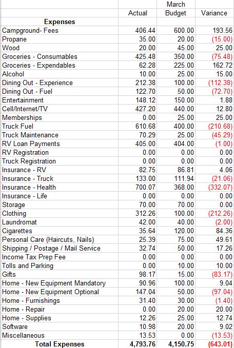 This month looks worse than it truly was from a budget perspective because of two major purchases.  We finally broke down and bought good hiking shoes (after I sprained my ankle) and those ran about $250.  We also had to double pay our insurance in March as we transitioned to a new policy and had to pay $309 upfront to make sure there was no gap in coverage. So if you take those two purchases out of the equation we were only $100 over which was pretty great considering how much activity we crammed into March.  See below for the details.