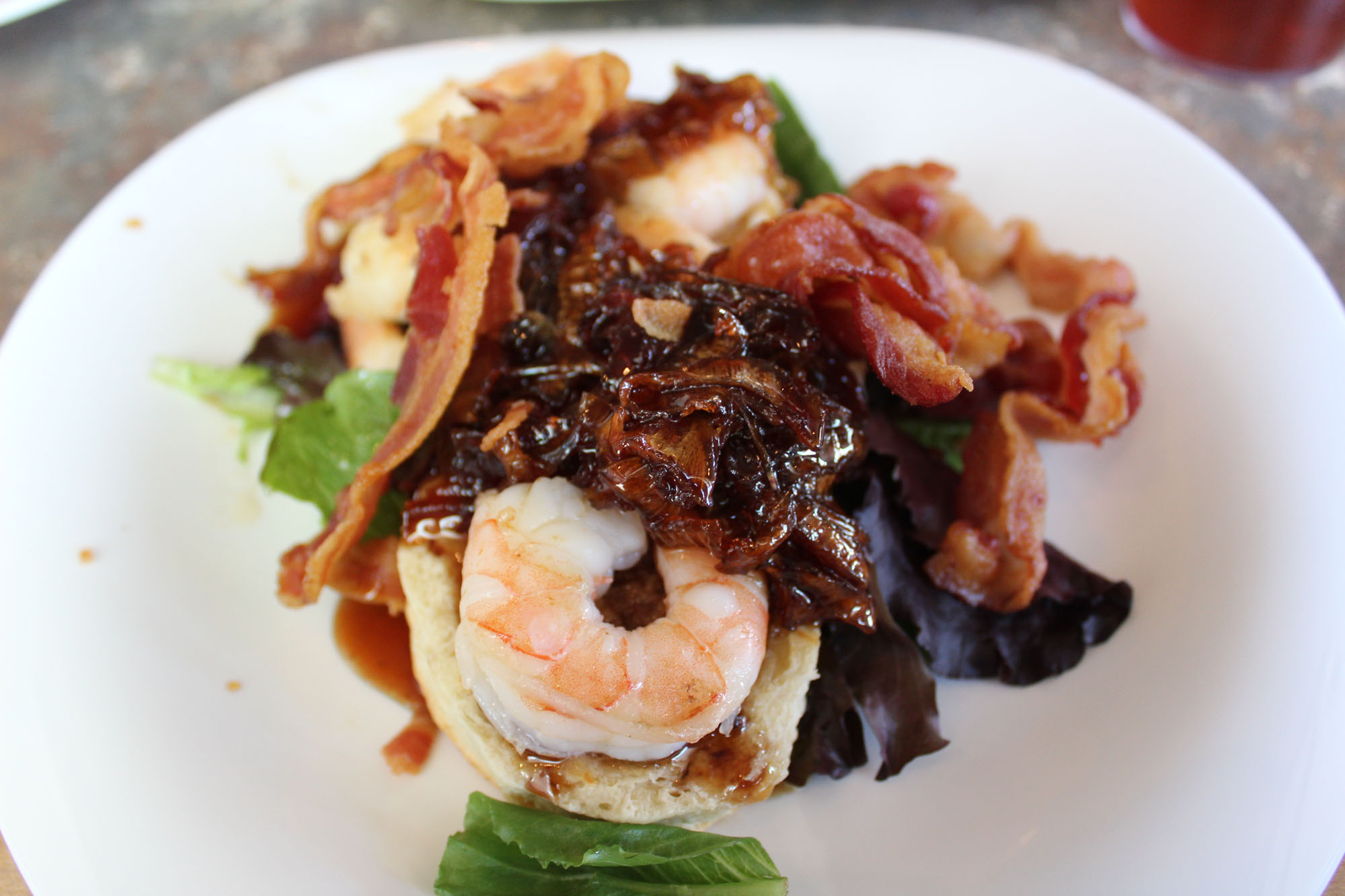 My deconstructed bacon wrapped shrimp was both pretty and delicious. It had a bourbon jam that was good and was on a fried biscuit