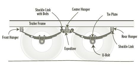 The image below shows the components. The shackle has two bolts and connects the leaf springs to the equalizer.