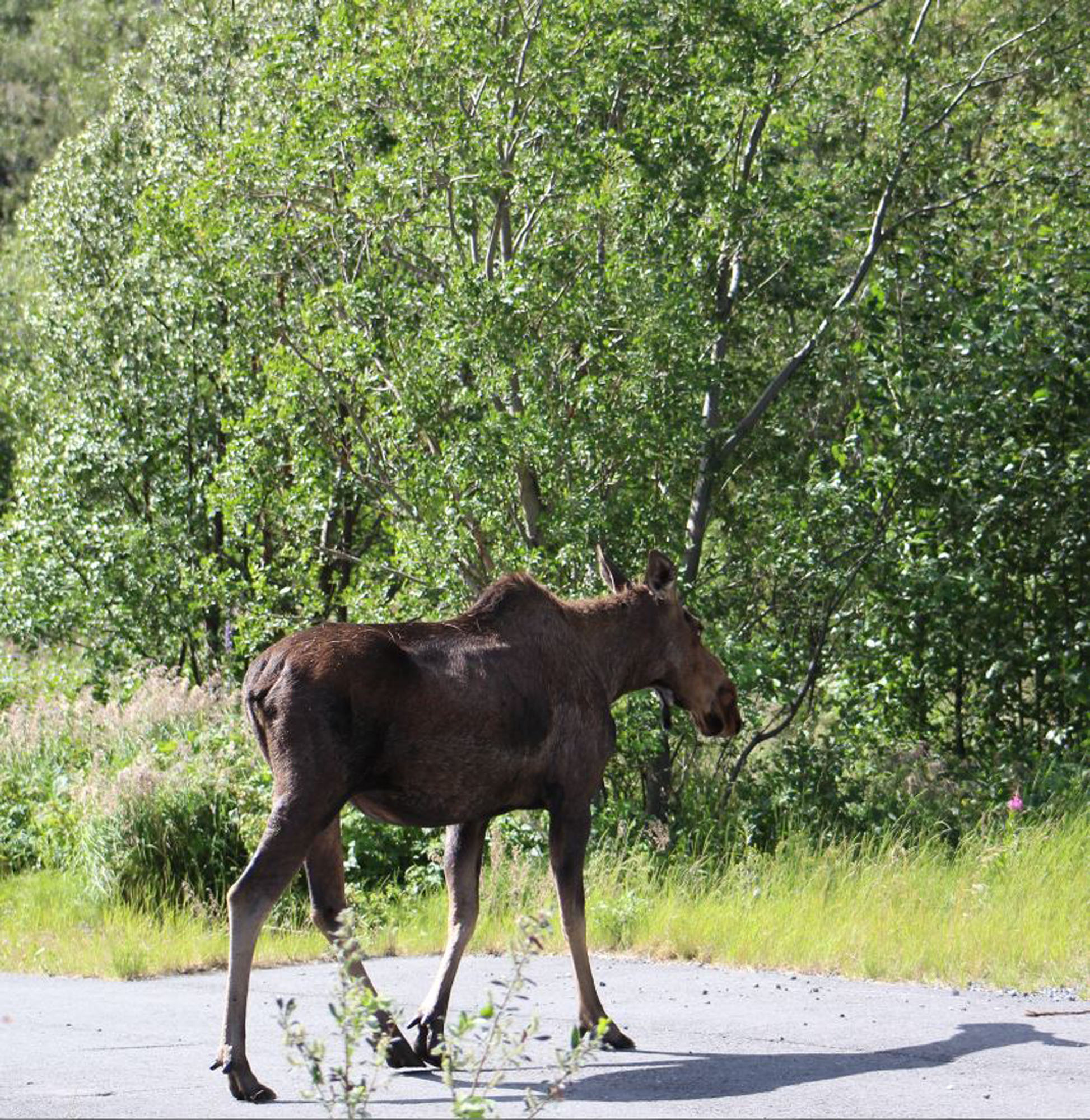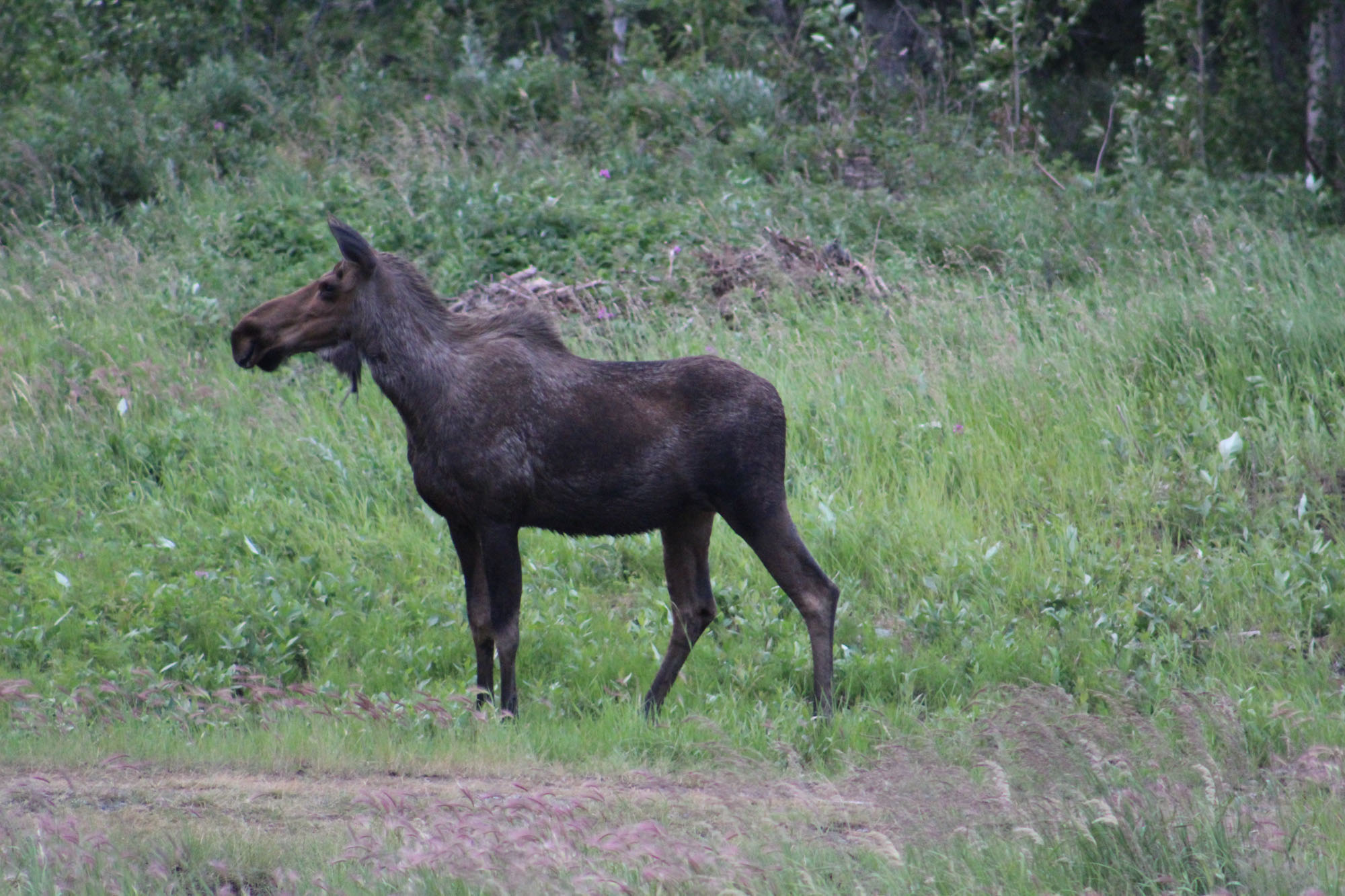 I could have spent more time in there, but Lee was getting a little restless, so on we went towards Chitina. This time we saw a moose right outside of town before we got there and we got a few shots of her as she crossed the road.