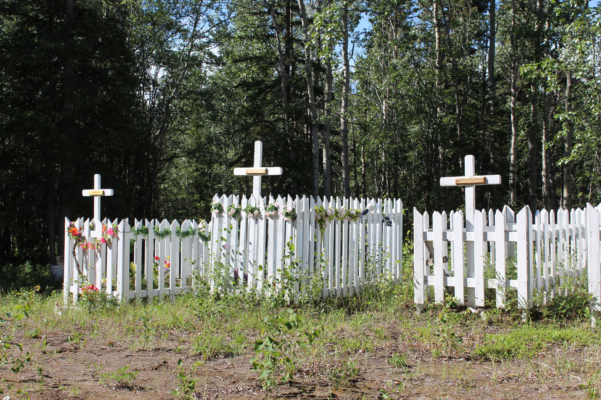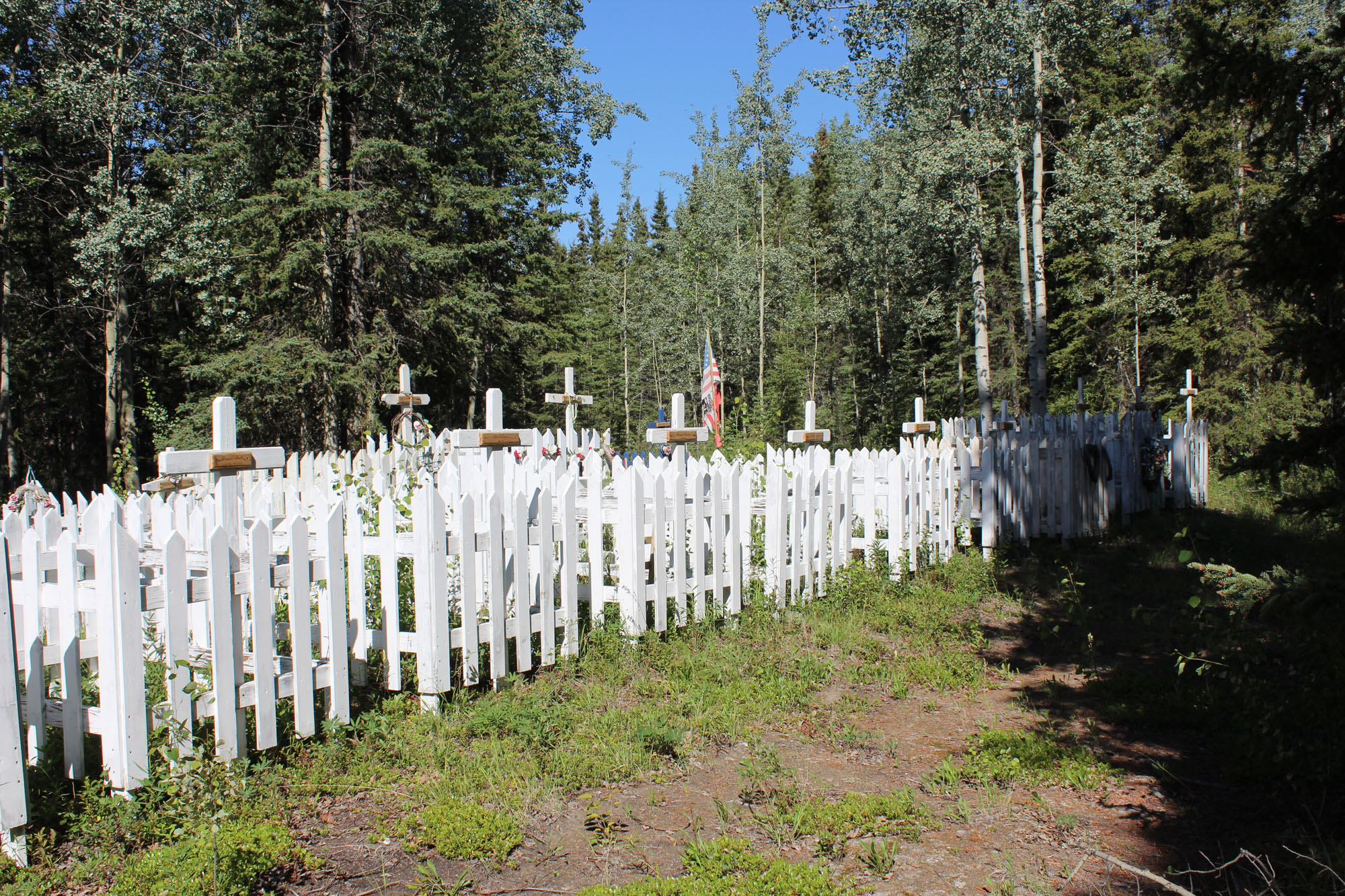 Instead of taking Richardson Hwy all the way down to Edgerton Hwy we decided to take Old Edgerton Hwy instead. The road was rougher and mostly woods, but along the way we did pass this family graveyard and I stopped to take a couple of pictures. Many of the cemeteries here follow the Russian tradition which is a reminder of the impact that Russians have had on the culture up here. Next to the cemetery are the ruins of a log cabin, but the graves themselves were obviously tended. Perhaps the descendants decided to move a little closer into town.