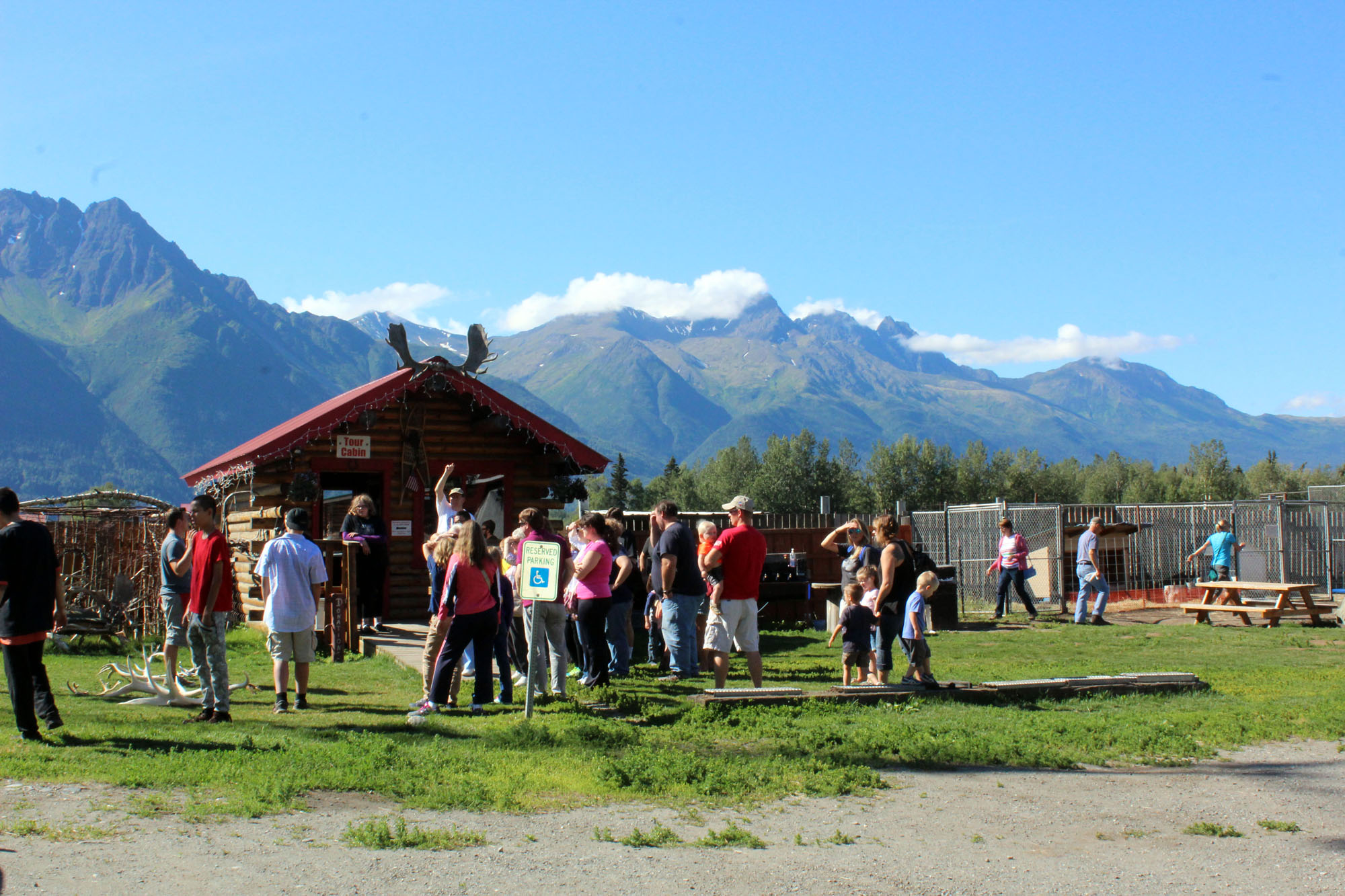 Our oil change light came on about 5 days before the trip and since the nearest Ford dealership is in Wasilla we booked a 9 am appt. This required that we get up early and out the door by 6am so I was pretty sleepy as we made our way to Anchorage. I hadn’t been in over a month though, so the views were all fresh again, and it was pretty pleasant until we got near Palmer. It’s a short construction season up here and since Palmer, Wasilla, and Anchorage are all relatively affluent towns we saw lots of construction. Still we made it in time and I enjoyed the free wifi in the waiting room. Afterwards, we backtracked to Palmer and managed (despite significant construction) to meet them at the reindeer farm close to 11am. The place was very busy with a tour group so we decided to each lunch first and enjoy the really pretty views. Plus they had a small petting zoo near the lunch area and we especially enjoyed the pigs that obligingly laid down next to the fence for a belly scratch.