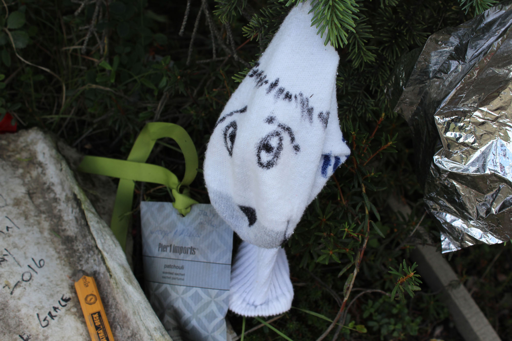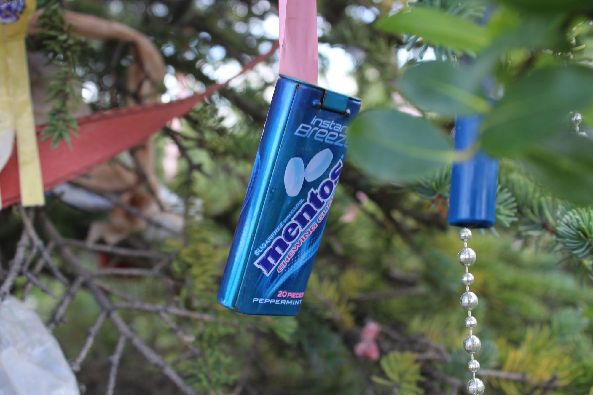 The views continued to be stunning but I was getting a little tired and was glad when we finally reached the Brushkana Creek Campground which is another BLM campground about 20 miles from the Cantwell entrance to the highway. I didn’t like this campground at all, but the road got much better from this point forward. And then something really magical happened. Between MP 107 and 108 we found an unexpected Roadside Attraction. You know how much I love those, and out here in the middle of nowhere there was a tree with lots of little special trinkets on it.