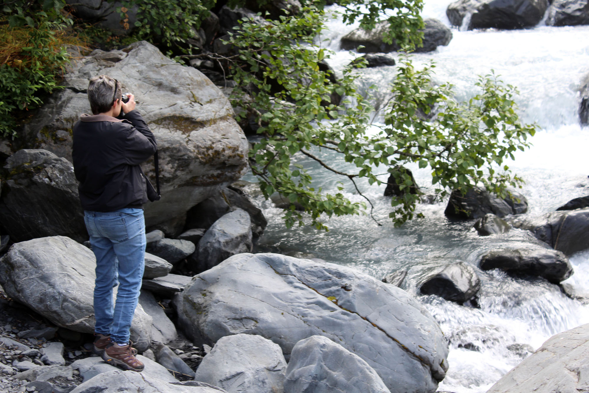 I didn’t do a very good job of planning this excursion, or maybe I was just confused, because I thought Whistlestop was a town. Uh..nope. It is as it is called; a whistle stop for the train, and all it has is a campground, some restrooms, and a wooden shelter. The train ride included a narrated hike to the glacier with a Forest Ranger, and since there was literally nothing else to do there, off on the hike we went. Turns out it was lovely and Maia our ranger was awesome. I actually learned quite a bit and the well maintained 1.25 mile hike each way was extremely easy. Maia stopped along the way to talk about the forest and the glaciers, and I learned several interesting things. For example, did you know that the mountains with rounded tops mean that a glacier at one point was over them whereas the mountains with sharp peaks were never capped by a glacier? She also explained that glaciers form U shaped canyons and rivers formed V shaped canyons in a way that actually made sense to me. Plus, once again we were lucky with the weather and even though it was overcast it never rained.
