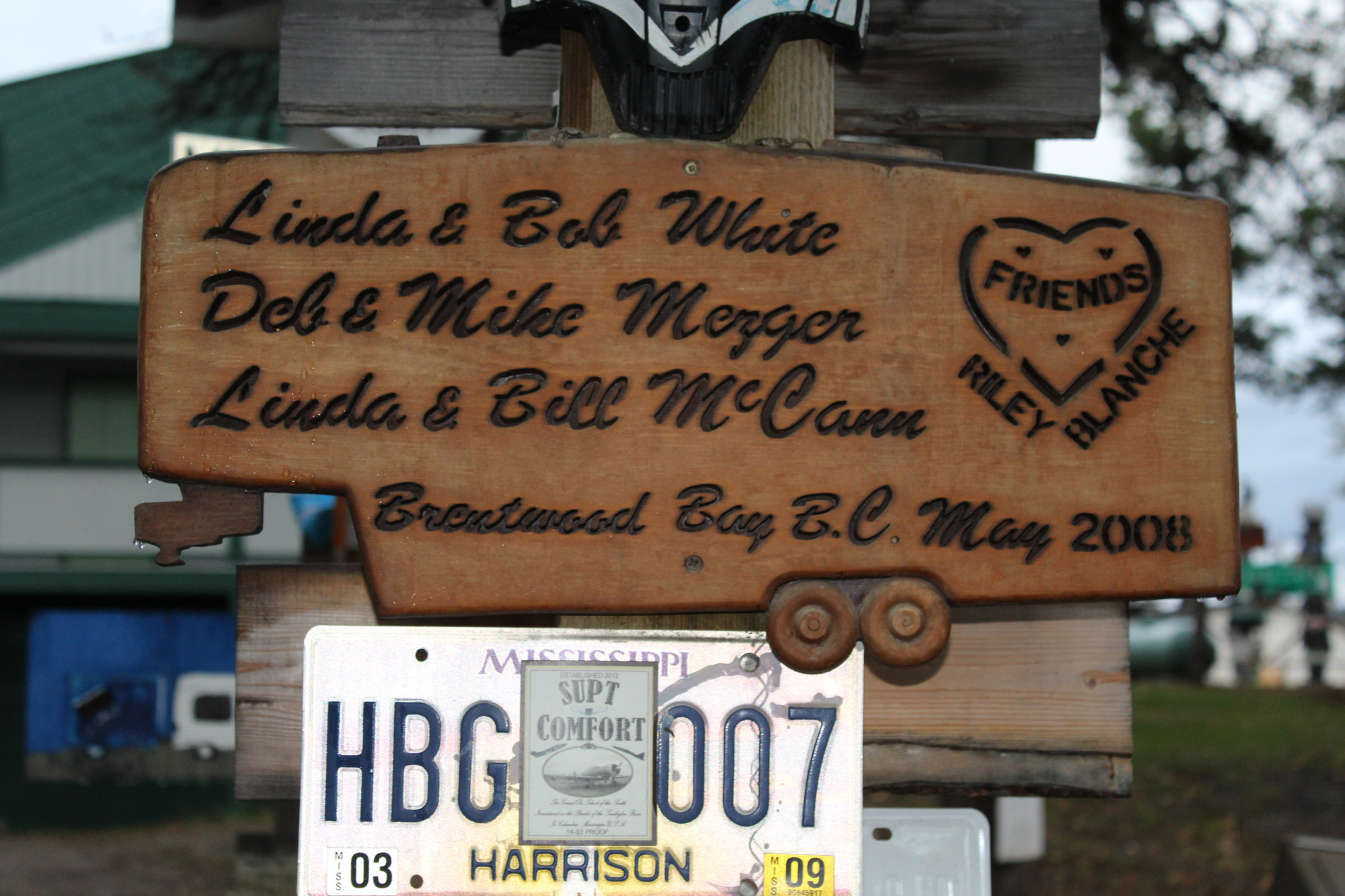 Next we stopped at Watson Lake and saw the sign forest.  This doesn’t look that great from the road, but I wanted to see it, and we were both pleasantly surprised.  It’s huge, and growing, for one thing, but the signs are also really cool.  We carry three license plates from New Hampshire in the rig and talked about leaving one, but just couldn’t give them up.  Next time though we will definitely come prepared.