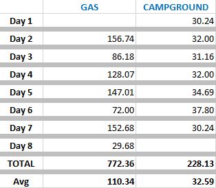 The big news from this data is it cost $110.34 per day for gas in Canada. I knew it cost a lot, but since you are often stopping twice in one day for gas it doesn’t seem that bad at the time.  We were mostly getting 8-10 mpg and were driving below the speed limit in all cases.  Gas is just expensive in Canada, and it’s a long haul from Alaska to the US.  The good news for us is that we got paid a couple more times in September and that will help defer the cost.