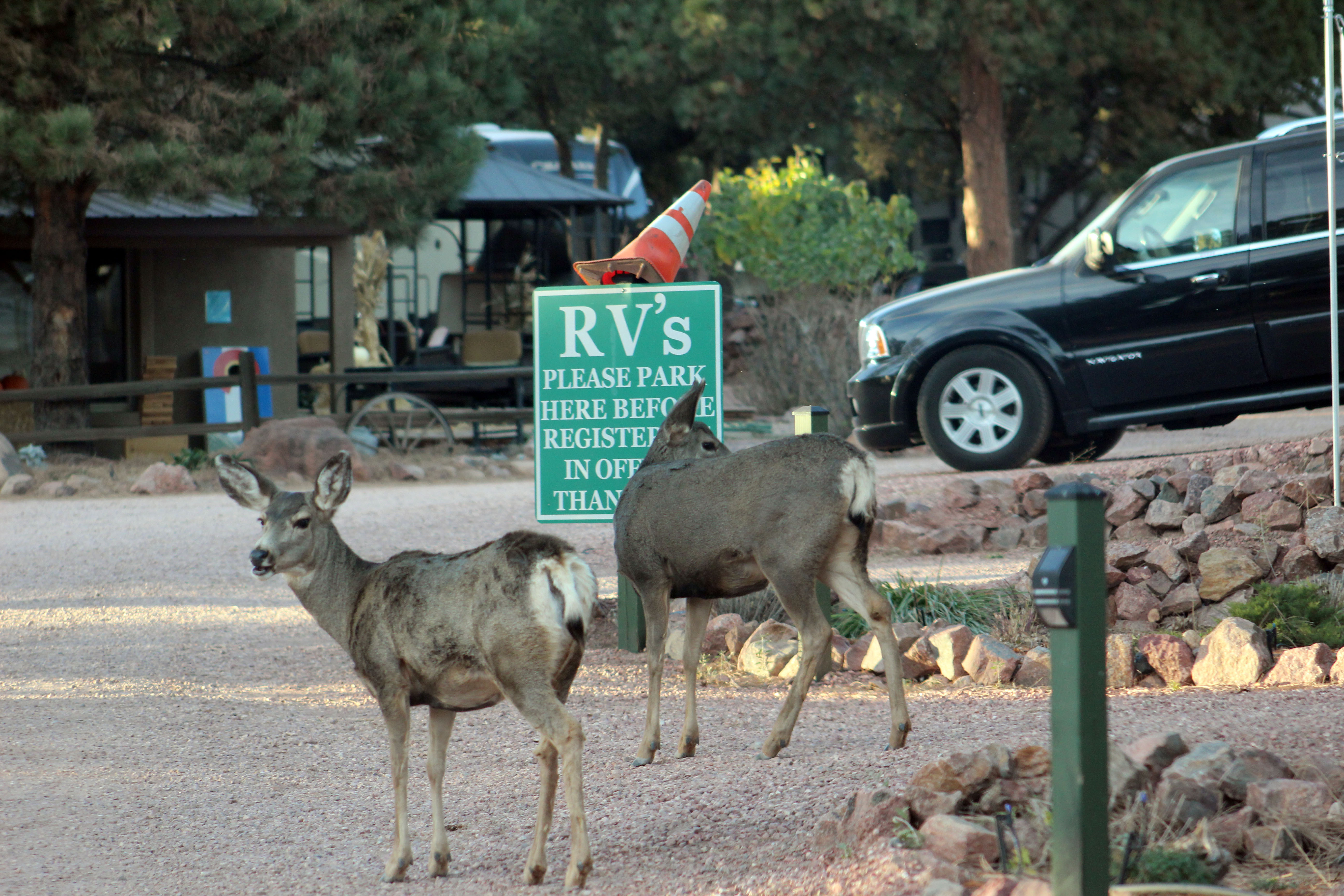 2. We also had some wind in that area but not bad enough to detour! Glad you made it though ok, but that’s a LONG detour! We also took the 470 around Denver – good decision – as we were warned traffic in mid-town is brutal! We haven’t gotten the toll in the mail yet. Love the pics of the deer at the CG! Thanks for the shout-out!