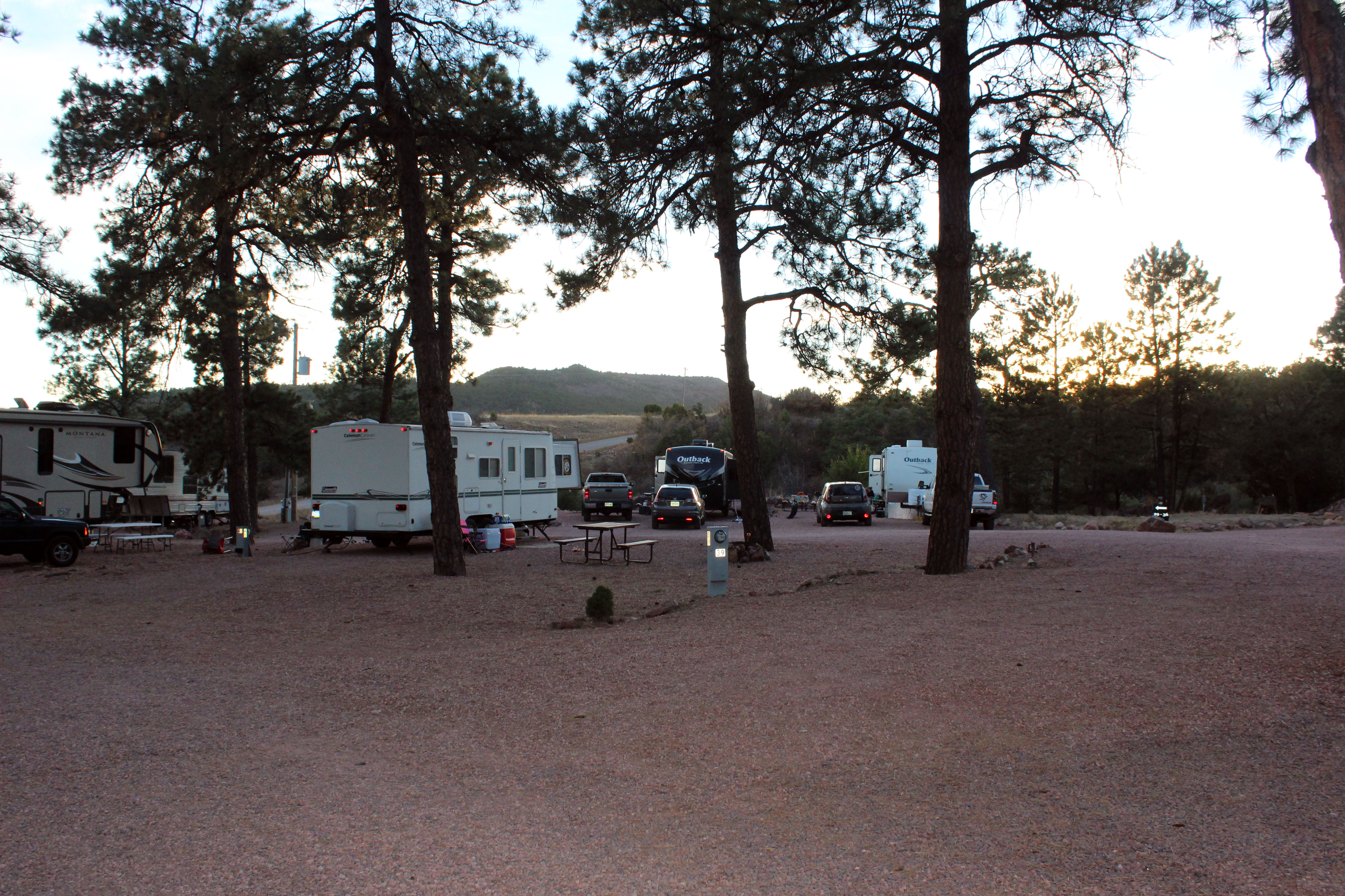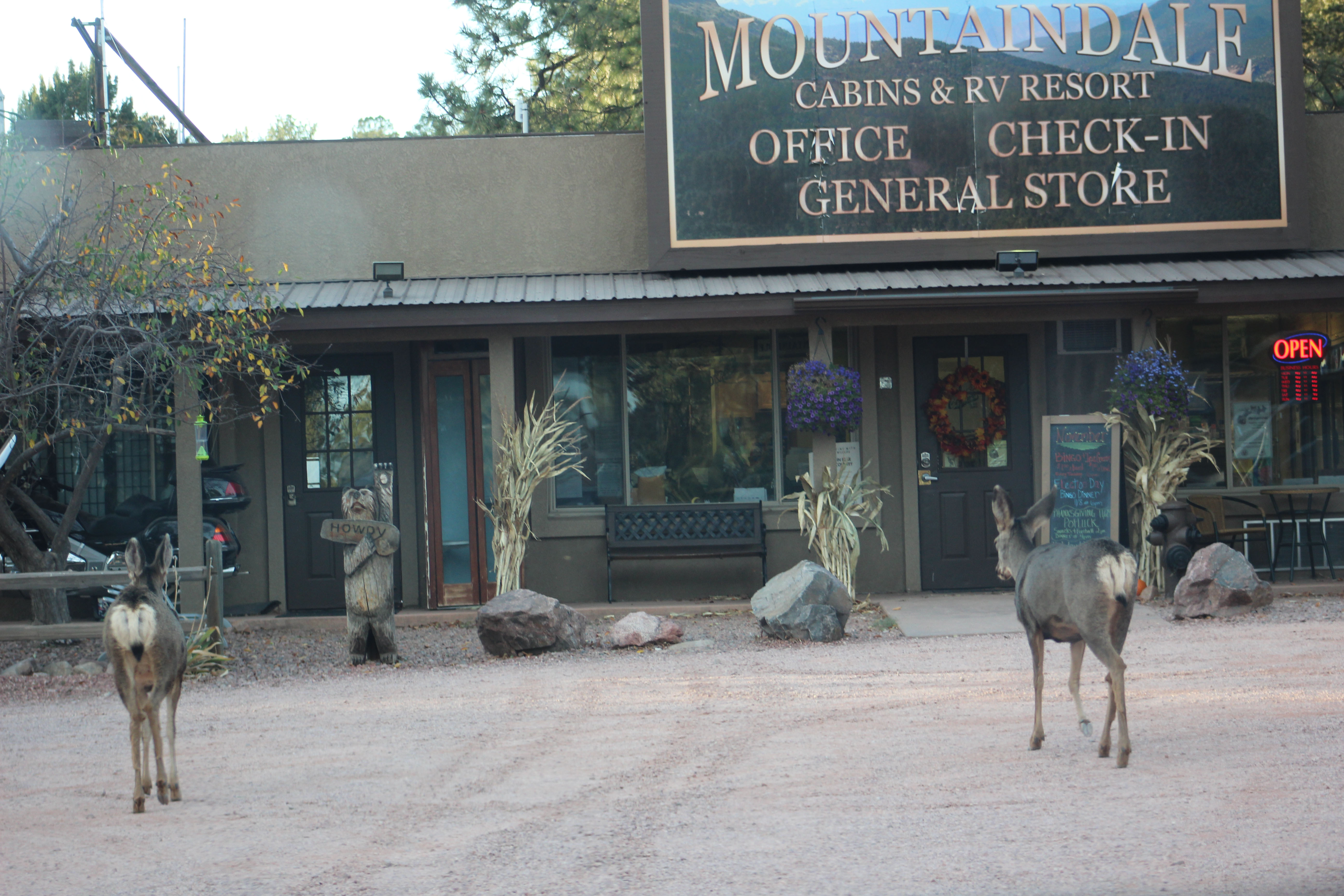 Several more miles down the road we finally made it to Mountaindale Campground and Cabins.  This campground was pretty far out into the country and it was surrounded by beautiful hills.  There were deer wandering the campground freely and lots of RV’s in use.  Definitely not what we were expecting.  Turns out this campground is no longer affiliated with Good Sam and as of Nov 1st goes to seasonal folks only in the winter.  Thankfully she had a spot for us as we were exhausted and although I had sticker shock at the $53 per night fee, we paid it.  It’s an odd campground.  Lots of people living here year round (they had 17 kids for trick or treat night on the premises), but it still looks and feels like a campground.  The monthly rate is $495 plus electric which is reasonable, so again not quite sure why the daily rate was so high.  Still at this point it was 6pm and we were done in.  We were supposed to call our youngest daughter, but texted her and rescheduled because we were both so tired and there was no cell service anyway. (We can call using WiFi but that’s been hit or miss in the past, and I was in no mood to mess with unreliable technology. – Lee) . This day really illustrates why we like to leave early and arrive early at campgrounds, in order to have time to make adjustments.  Still, it was a beautiful place and very, very quiet.  It was the first campground I have stayed at without any road noise in a really long time.