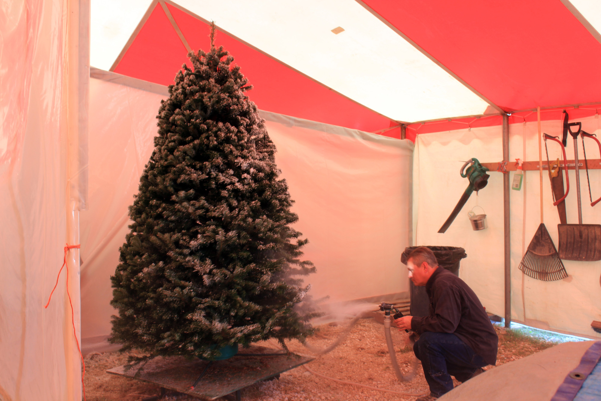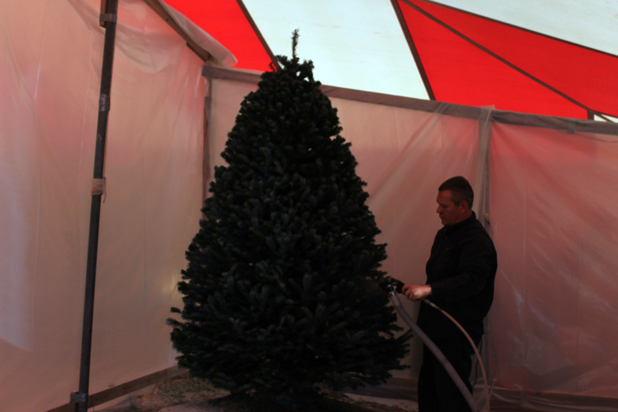 Lee putting a tree on the shaker.  We do this before customers take them home or before they are flocked