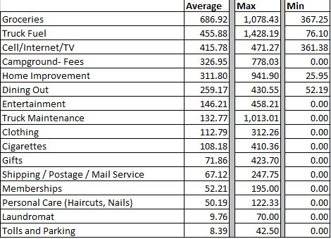 Home Improvement – Despite intense focus on this category we ended up almost the same at $3714. Tracking these costs in more detail did help though, because we definitely spent more this year on necessary purchases than supplemental. We had several unexpected repairs and those coupled with one time expenses to get setup for long-term boondocking in Quartzsite accounted for $2211 in spend. Two years in I don’t see this category ever going down much (although Lee continues to be hopeful), we ended 2016 with a repair and started 2017 with another and we had some sort of repair almost every month in 2016. At this point it seems to be a natural cost of the lifestyle. Our monthly average is $311 which is close to $100 more than we want to spend a month. As you can see from the $942 maximum though that one or two major repairs can really blow the yearly average, regardless of how well you do the other months.