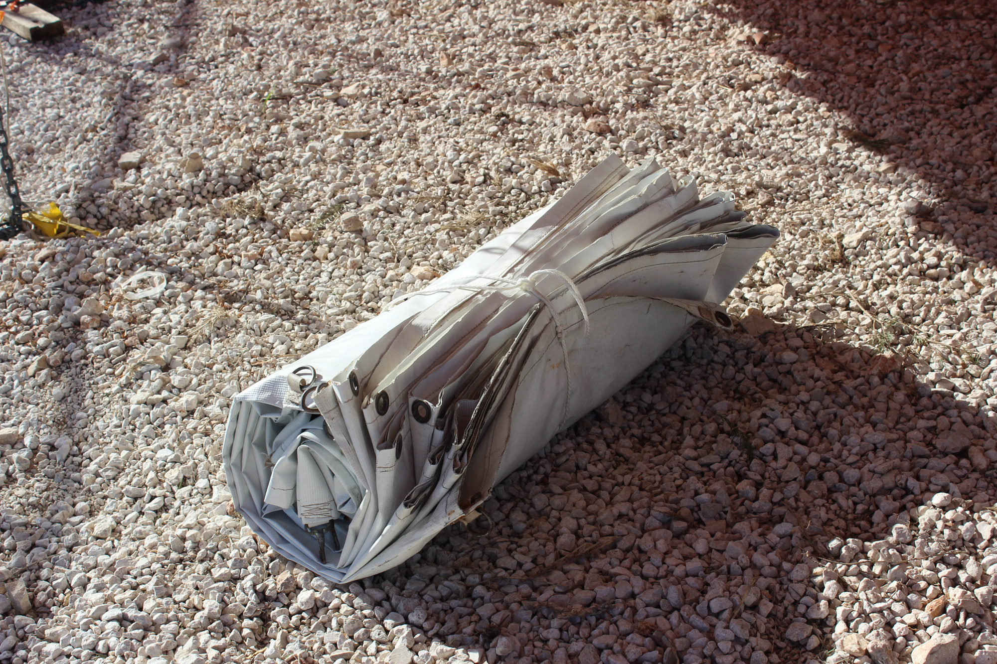 First they took the side walls down. They clip onto a rope that runs along the tent, and each side panel is about 100′ long.