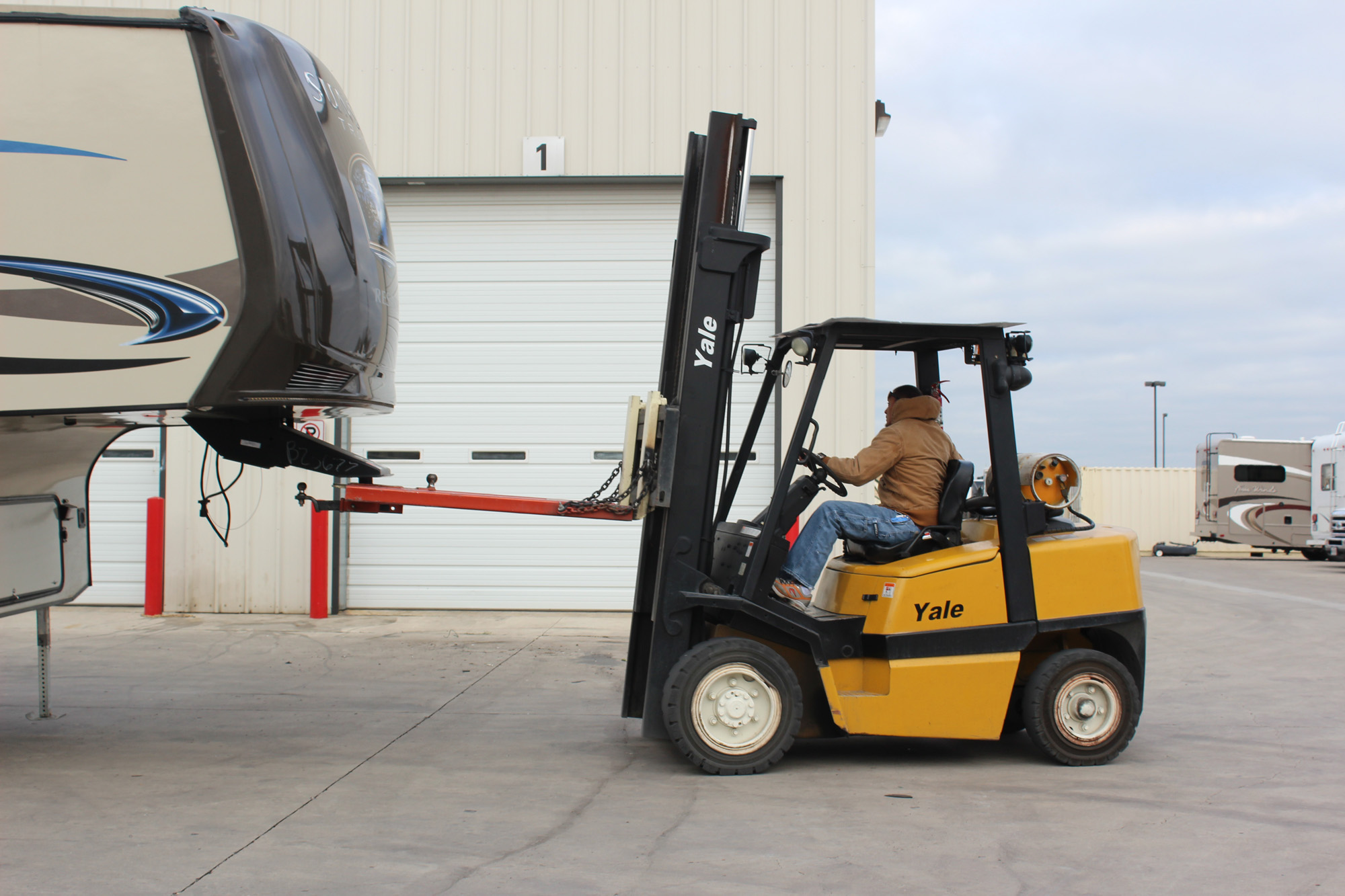 Being full timers of course complicates this, but when Lee called and talked to Jayme, the service coordinator, he felt very reassured.  She was familiar with full timers and their needs and scheduled us a technician that would be dedicated to solving our problem so we could be assured we wouldn’t be left with an undriveable rig in pieces at the end of the day.  Pulling in went fine.  This particular service station was huge, with tons of bays, and we followed the red lines (as instructed) and then dropped the fifth wheel in the parking lot.  Then they bring a cool machine out which takes the fifth wheel back into the proper bay.  We got to see that in action and it was impressive how those machines maneuvered the fifth wheels.  We could use one of those to get into some state park sites!