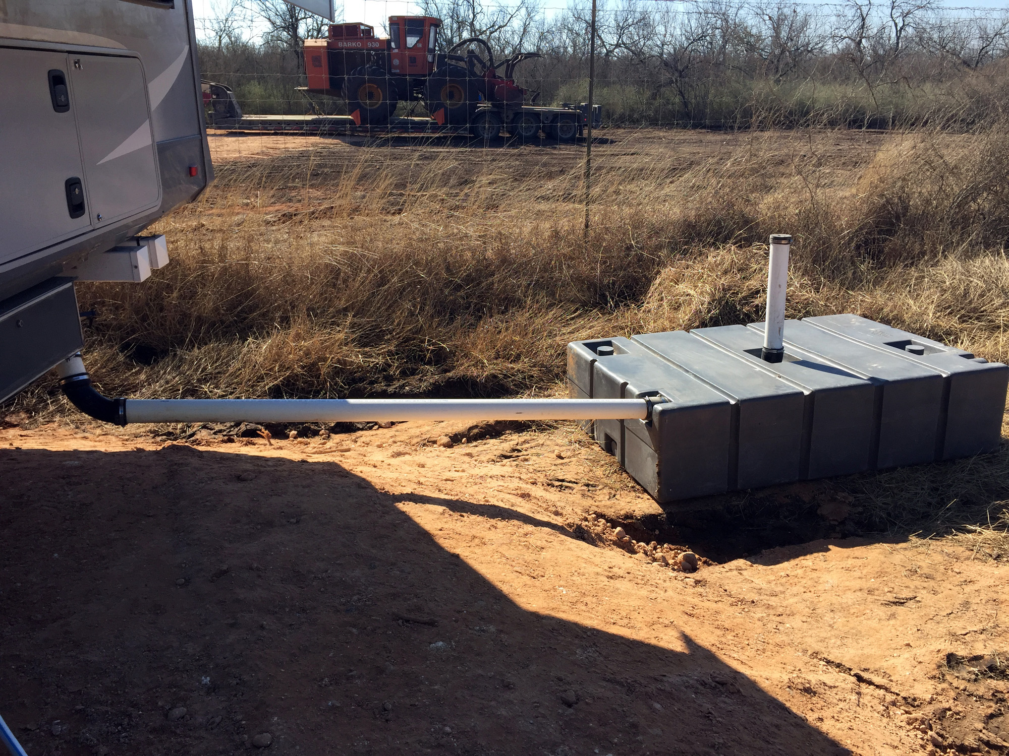 The next morning the Account Manger came and got us and we drove up to the gate. They were just finishing up the pad and we started talking about where exactly to place our rig when the trailer with the fresh water tank, generator, and light tower arrived. Our pad is on the smaller side, and we wanted to make sure it was as far as we could get it from both the trucks coming in, and the generator (which runs 24/7 unless we want to turn it off during the day) so we started to talk it through. In the past we would have rushed through something like this, but we both know how important it is to be comfortable in your space, and it’s a pretty big pain to change once you are all set up. The Account Manager was very patient with us, allowing us to take all the time we needed, and she started checking trucks in for us as they started to arrive. Eventually we picked a spot and got the service trailer in place, plus the black water tank was delivered as well so that was all hooked up.