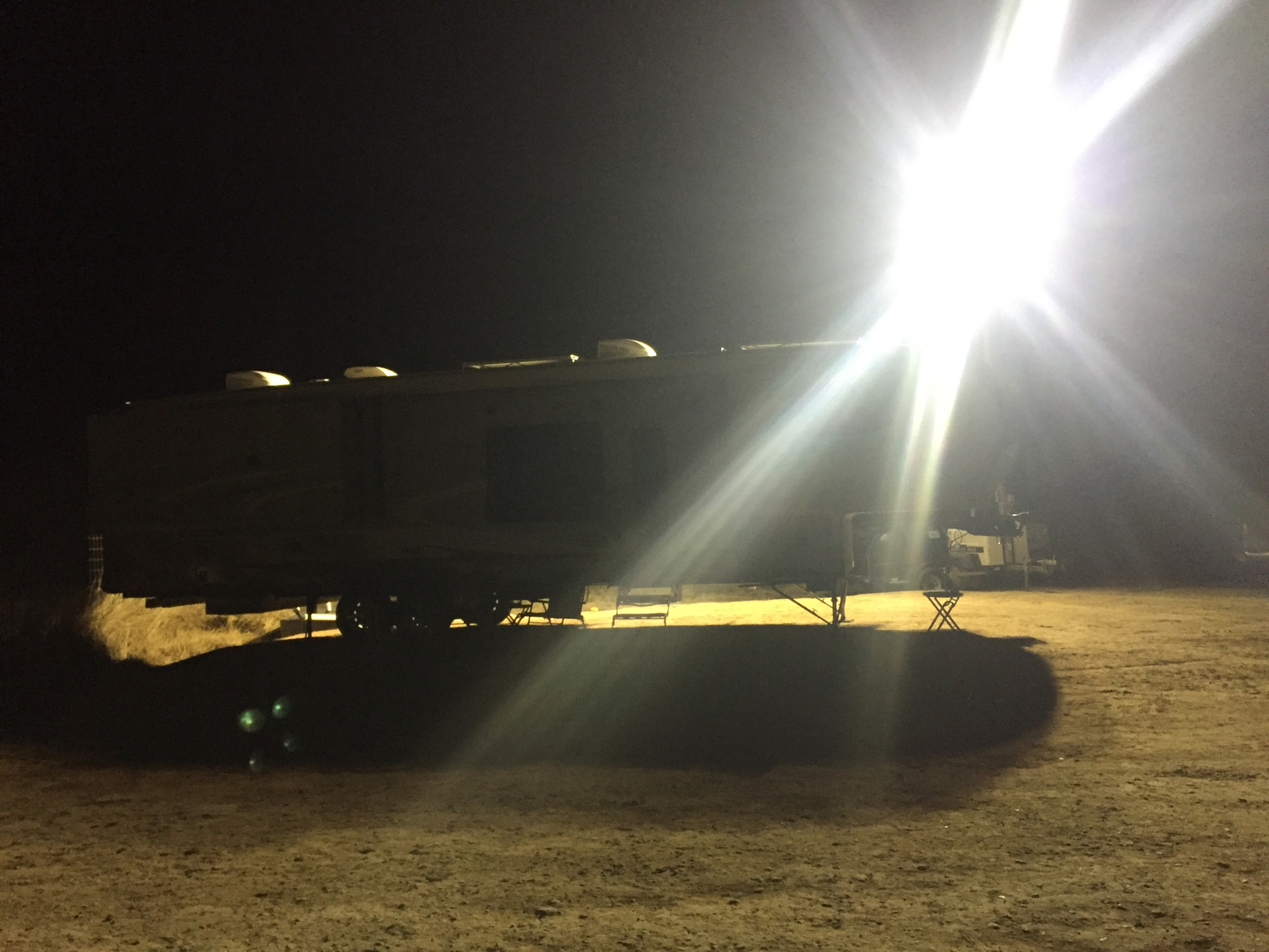 Everything was going pretty well at this point. We are extremely level, the generator (which we both had major concerns about) was far enough away that it wasn’t too loud, there were no smells from the black tank or generator, and water was hooked up. I was learning the job and it seemed pretty straightforward. Log truck in, log them out, and be friendly. There was more to it of course, but compared to what we have been doing recently, pretty simple. (And no heavy lifting, or getting pine needles in our underwear. Don’t ask. – Lee) Everyone was super nice and very chill, and I was definitely liking the vibe of the whole thing. The first thing that went wrong was the lighting mast. In the picture of the service trailer you can see the lighting mast sort of laying down on the top of the generator. There is a hand crank and a wench that pulls a cable to move the mast to an upright and vertical position, then another crank that telescopes the mast to about 30′ in the air. Steve was cranking it to the vertical position when the cable broke, and the mast fell back down. So someone will be coming out tomorrow to repair that, and in the meantime, they are bringing another smaller trailer with just lights and a generator so we can have lighting tonight. It’s really, really dark out here at night.