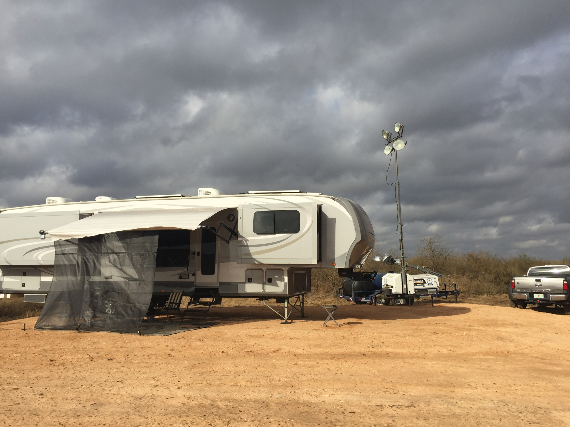 My husband put rope lighting all around our rig and trk so I had extra light at night!!!!! Also helps keep animals and snakes away. I have heard that works, or a black hose. So far we haven’t seen anything but may go that route as well.