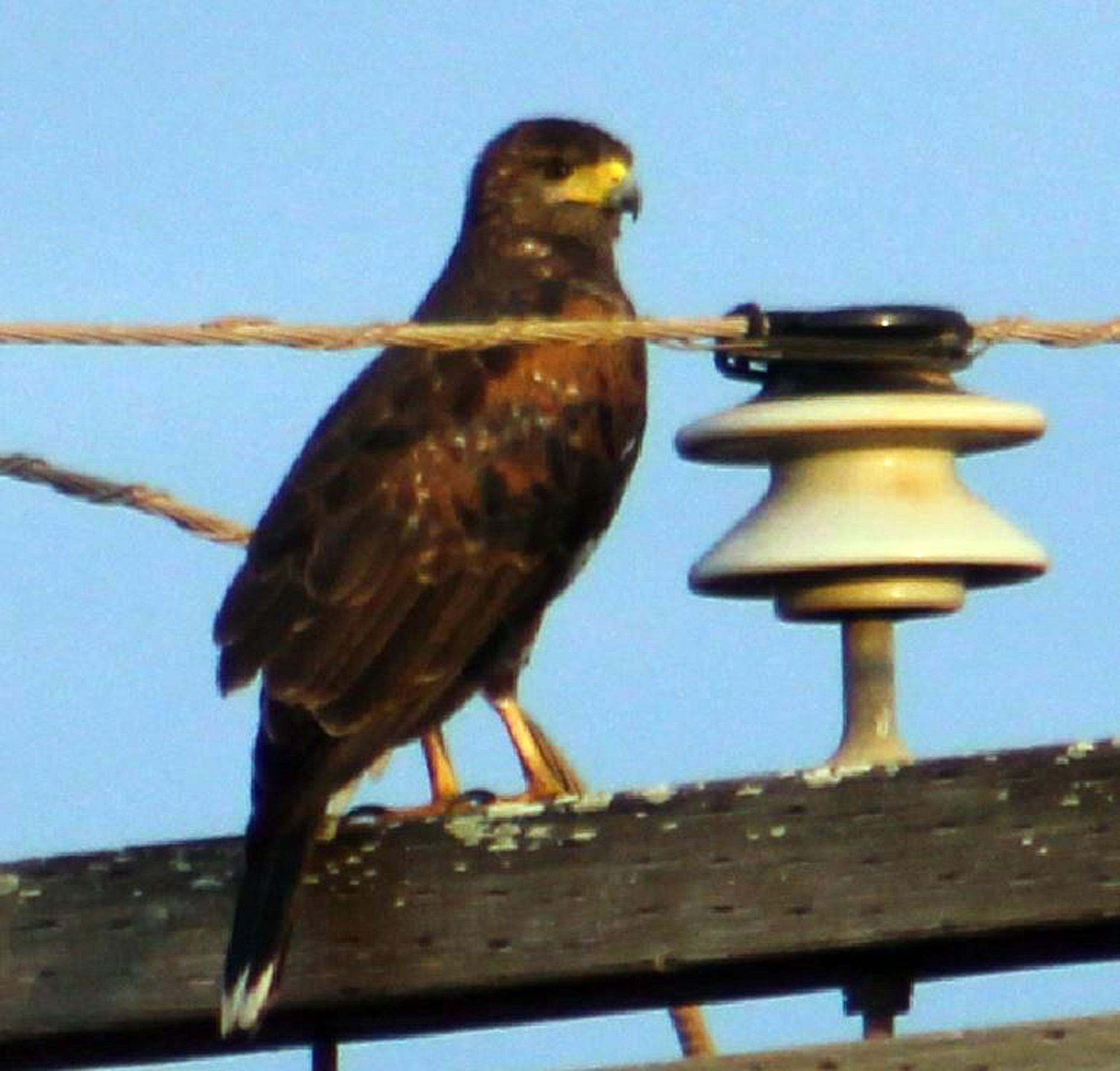 The only two exciting things that happened today were an oil truck got stuck going back to the water well and it took two big tractors to pull him out. That all happened rather late and he had to dump all of his water in a field to lighten the load and then come back with another one. Opening and shutting the gate at night is a bit of a challenge because the new lights they set up do not light the entire area, but I am getting used to it. I also got another new bird which was pretty exciting. The Harris’s Hawk (cool because that is my maiden name) is unusual for this area and the only raptor that nests and hunts in groups. We saw some raptors in the tree across the street from us, but every time I got close they flew away. This one was on the pole and I got a couple of shots from the rig with my long lense but as soon as I took two steps towards it it flew away. It’s cool though we know what is living over there and hopefully I can get some better pics. We originally thought it was the same bird as the other day, but this yellow band gave it away. Very fun!