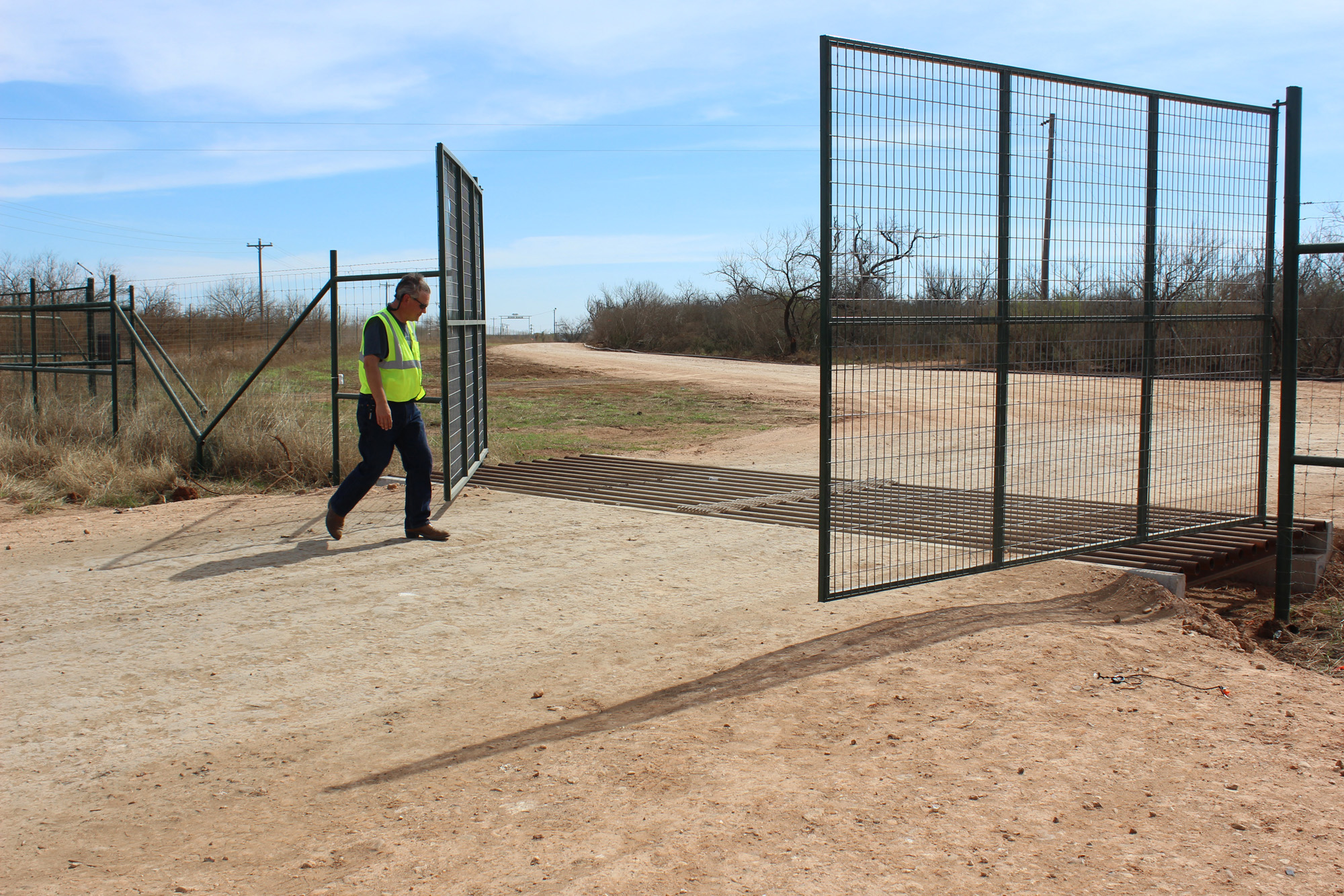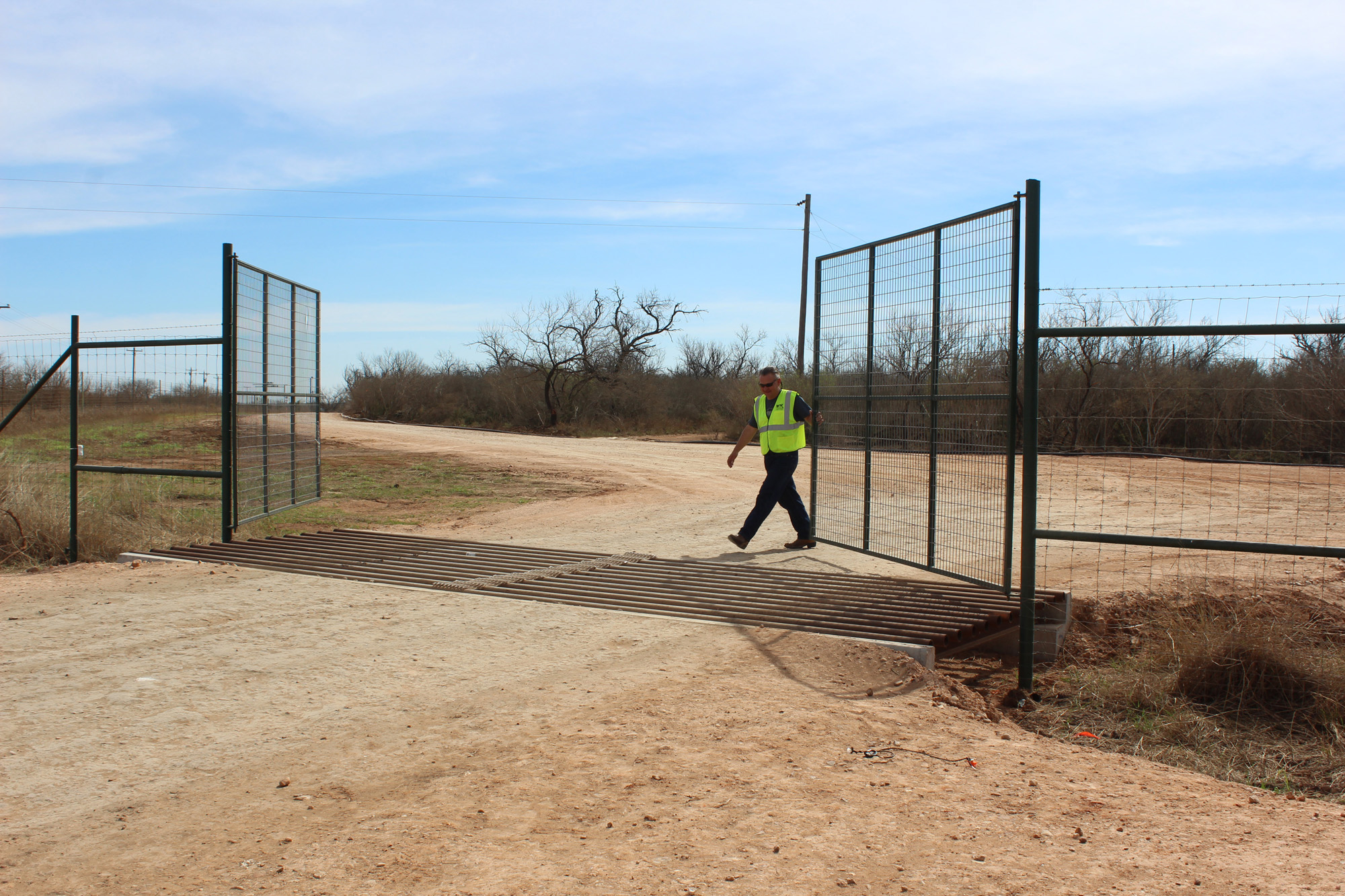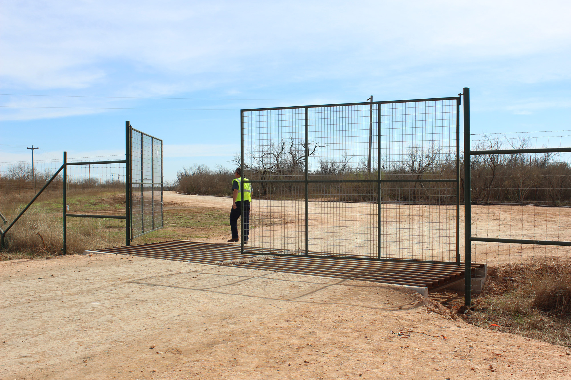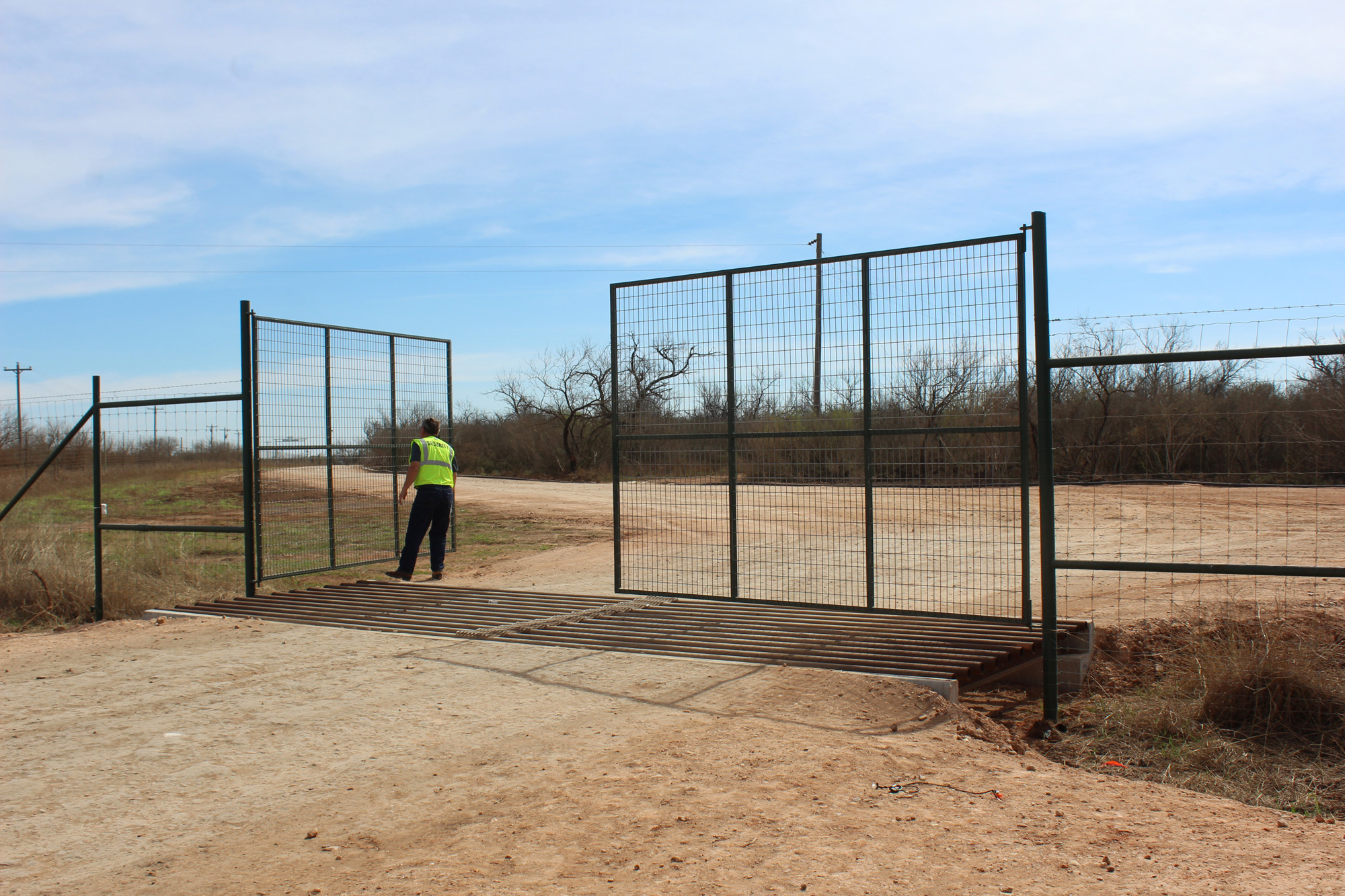 Typically you only pin one panel. Push the free one open and walk the other one back.The gate belongs to the Ranch, From my experience, if it has to do with oil business and not ranch business as in your case, the Company Man would determine if it is a valid request on your part and then ask the landowner.