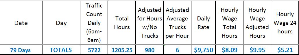Hourly rate is interesting. If you count the 24 hour period, the rate was $5.21 which is below minimum wage. If you look at the rate between the first and last truck it was $8.09 an hour, which is above minimum wage in Texas, but because it is a contract position no taxes were taken out and their might (depending on your deductions) be an extra tax burden. If you just look at hours we got trucks the rate is $9.95, which is better but still under $10.