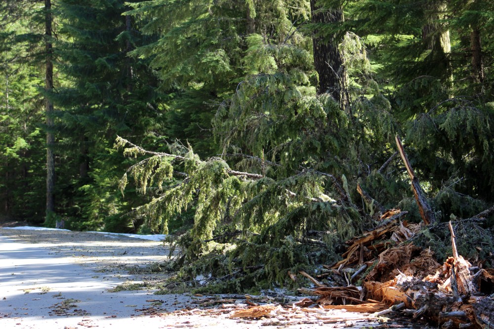 One of the many trees still in the road. They had been cleared from one lane but not removed yet. This big one was covering the left lane completely.