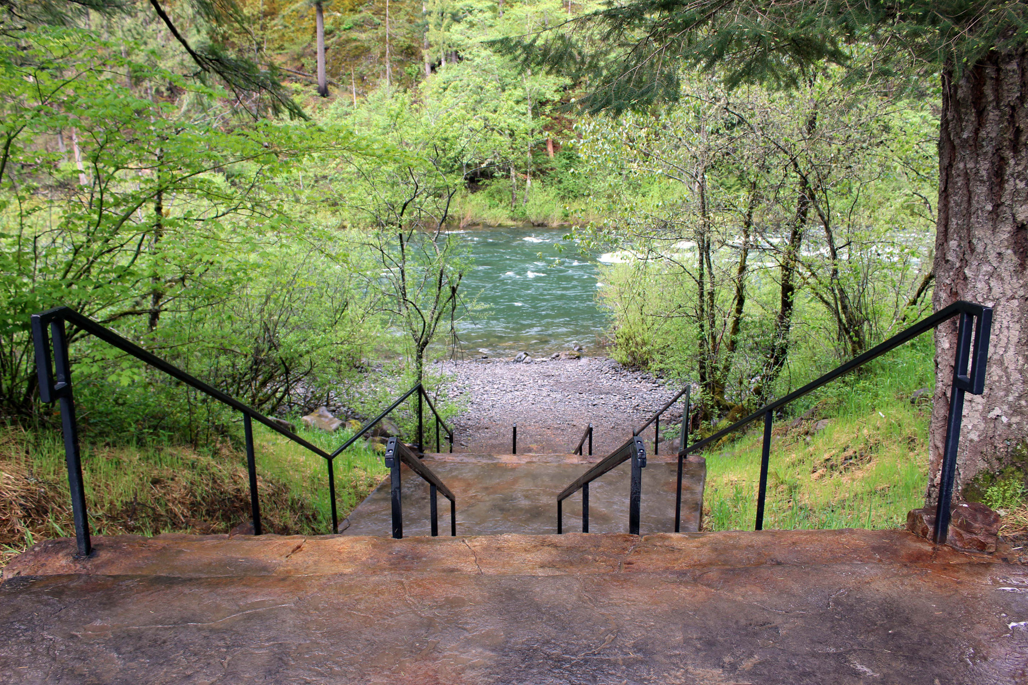 Moore Creek Boat Access Site – This is our busiest rafting site as it not only has a pit toilet but two changing rooms. The rafting companies meet their customers here, and they use the changing areas to put on wet suites. We’ve met some of the rafting company employees and they are very nice, which is great since we will be working with them all summer. We are giving them business cards with the campground office phone number and encouraged them to call us if they see any problems. They informed us the common times they use the site are 9:00am -9:30am and 12:00pm -12:30pm, which was very helpful, because we will know when to schedule our cleanings. This is an older site and doesn’t have the modern boat launch stairs yet, but instead has a cool rock path.