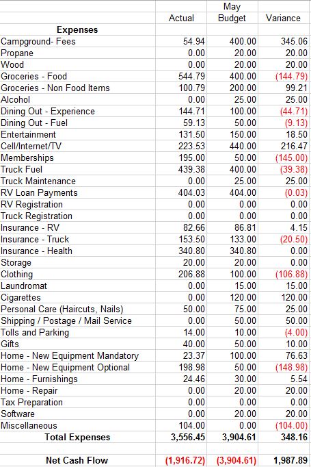 We did better than I thought this month with $3556 in expenses. We also received our first paychecks which brought in $1640 in revenue leaving a monthly deficit of $1917. I was very happy to see though that our net cash flow YTD is $967.22. This does not include the week in Vegas which we treated as a vacation and used savings to pay for. The numbers tell a pretty good story. We are breaking even so far this year, but to stay on pace this summer we will need to sock away enough for the month of down time in October. We also have scheduled a $3500 Mor-Ryde upgrade in October, but we are working Amazon in November and December to help recover some of those costs. I’m pretty excited though because I would have bet money we would be in a negative cash flow position once we received our first pay checks. The detail of the month is listed below.
