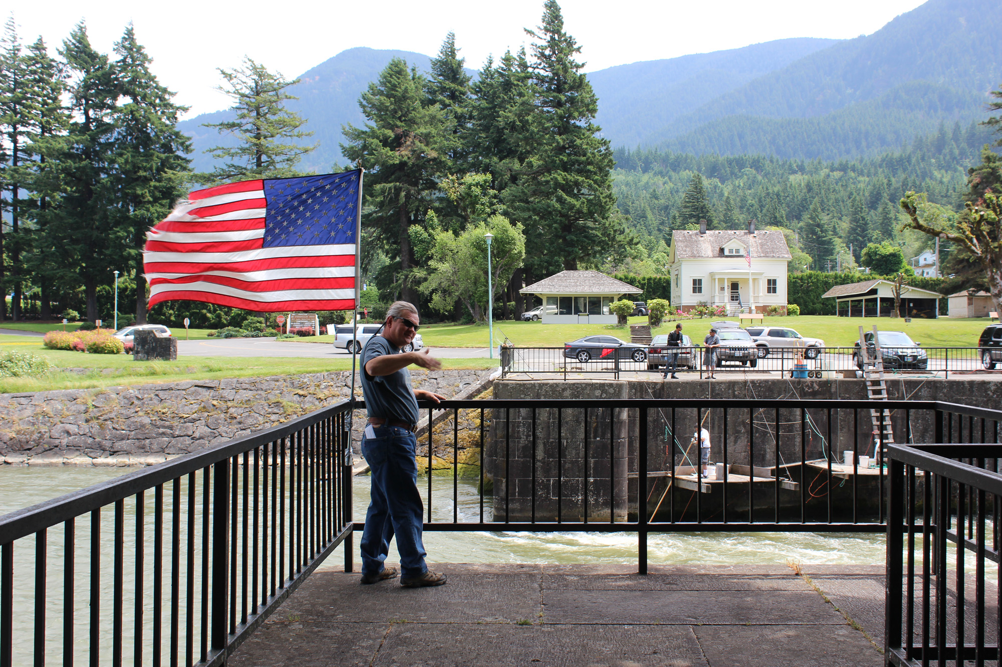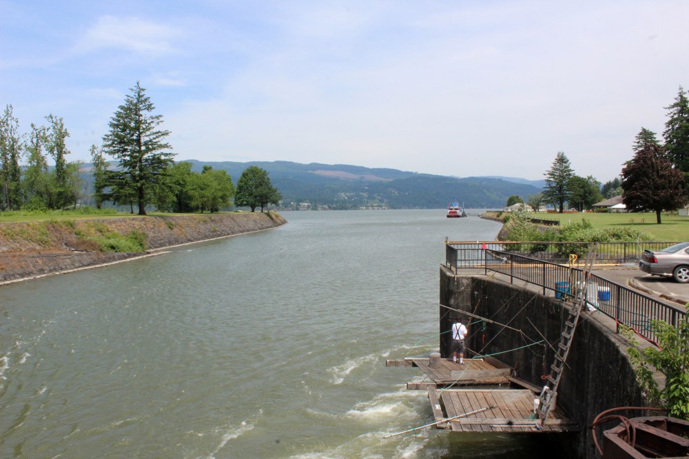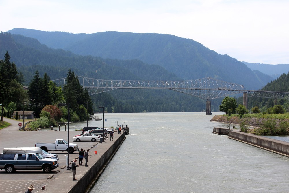 After the dam we crossed the Bridge of the Gods to the Portland side and viewed the historic locks.  We really should have done this when we were on the Oregon side, but somehow we missed this the first time around.  It cost $3 each way to cross the bridge ($2 if it’s a regular car or truck), but despite the cost I am glad we did it because by sheer coincidence we got to see a Native American dip net fishing from the locks which was a great moment.