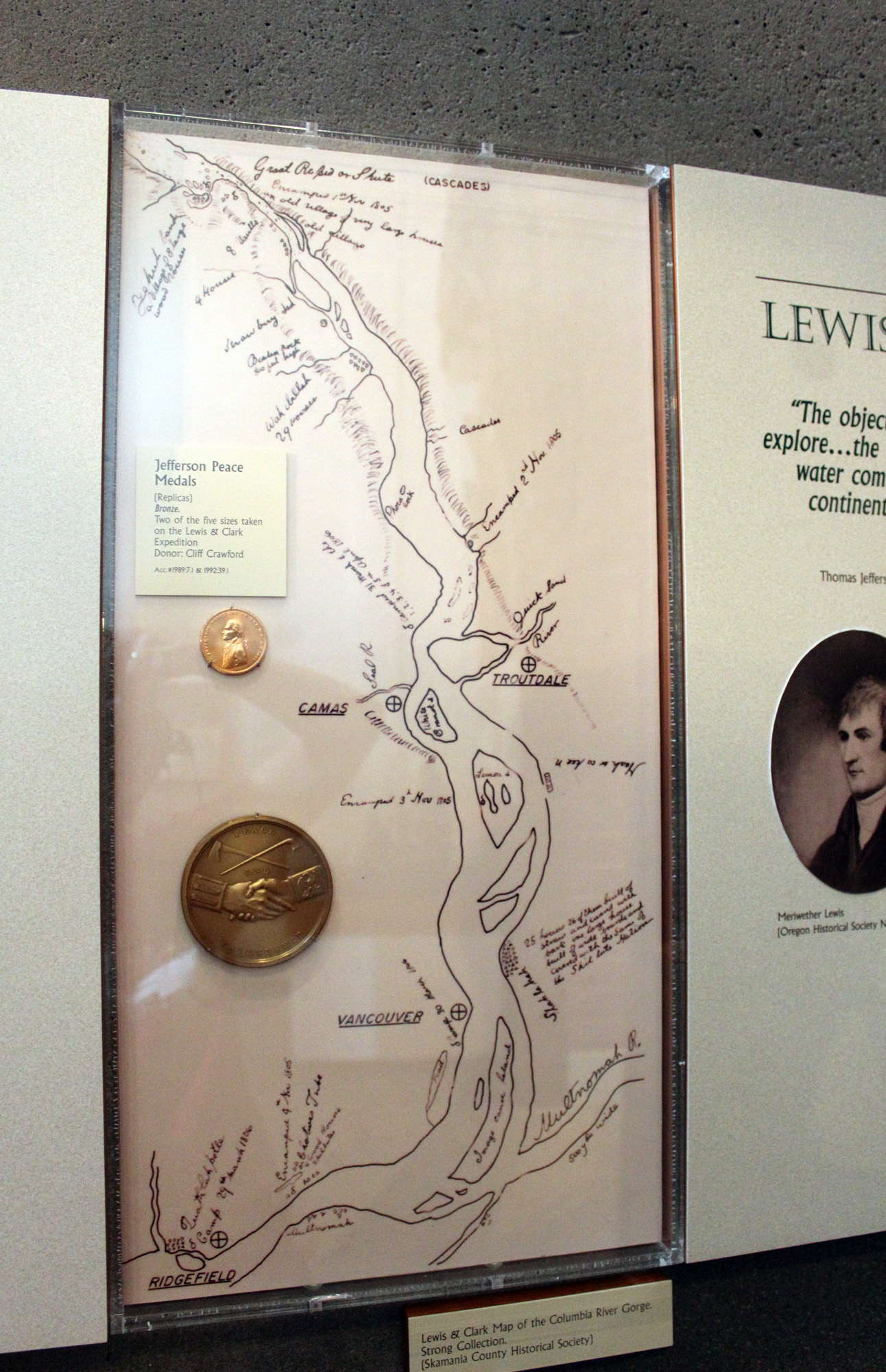 This was one of my favorite pieces. A map of the area as drawn by Lewis and Clark and two of their many medallions they handed out during their travels