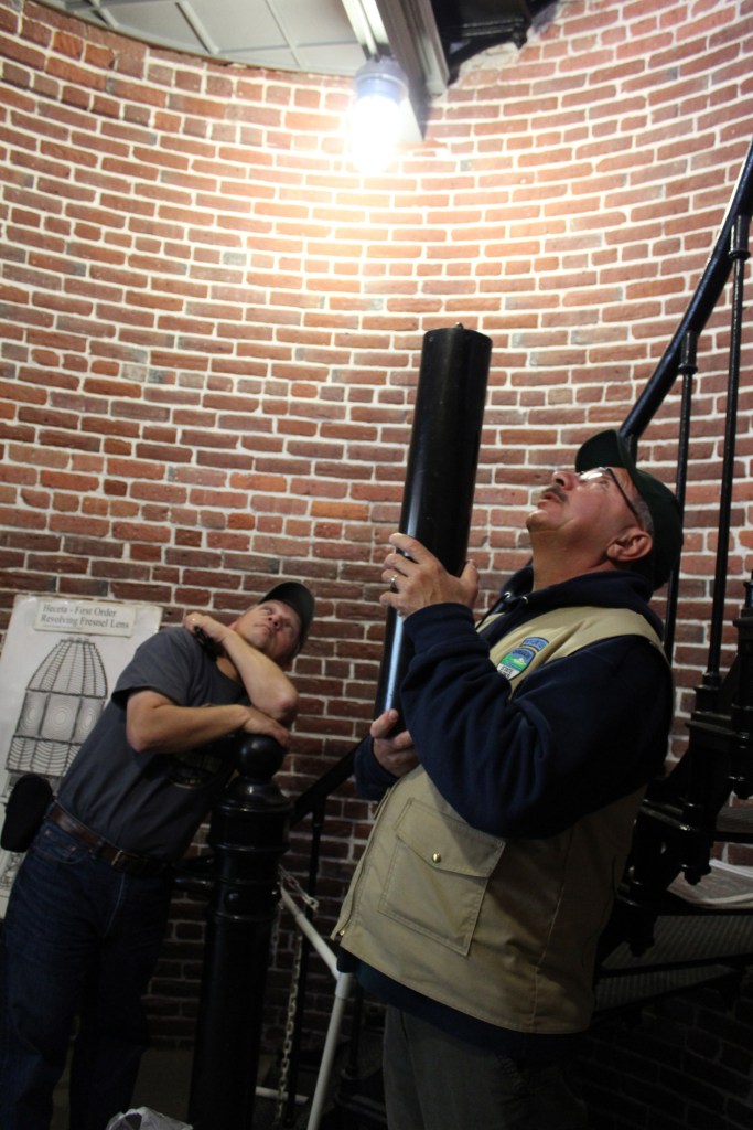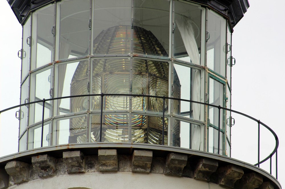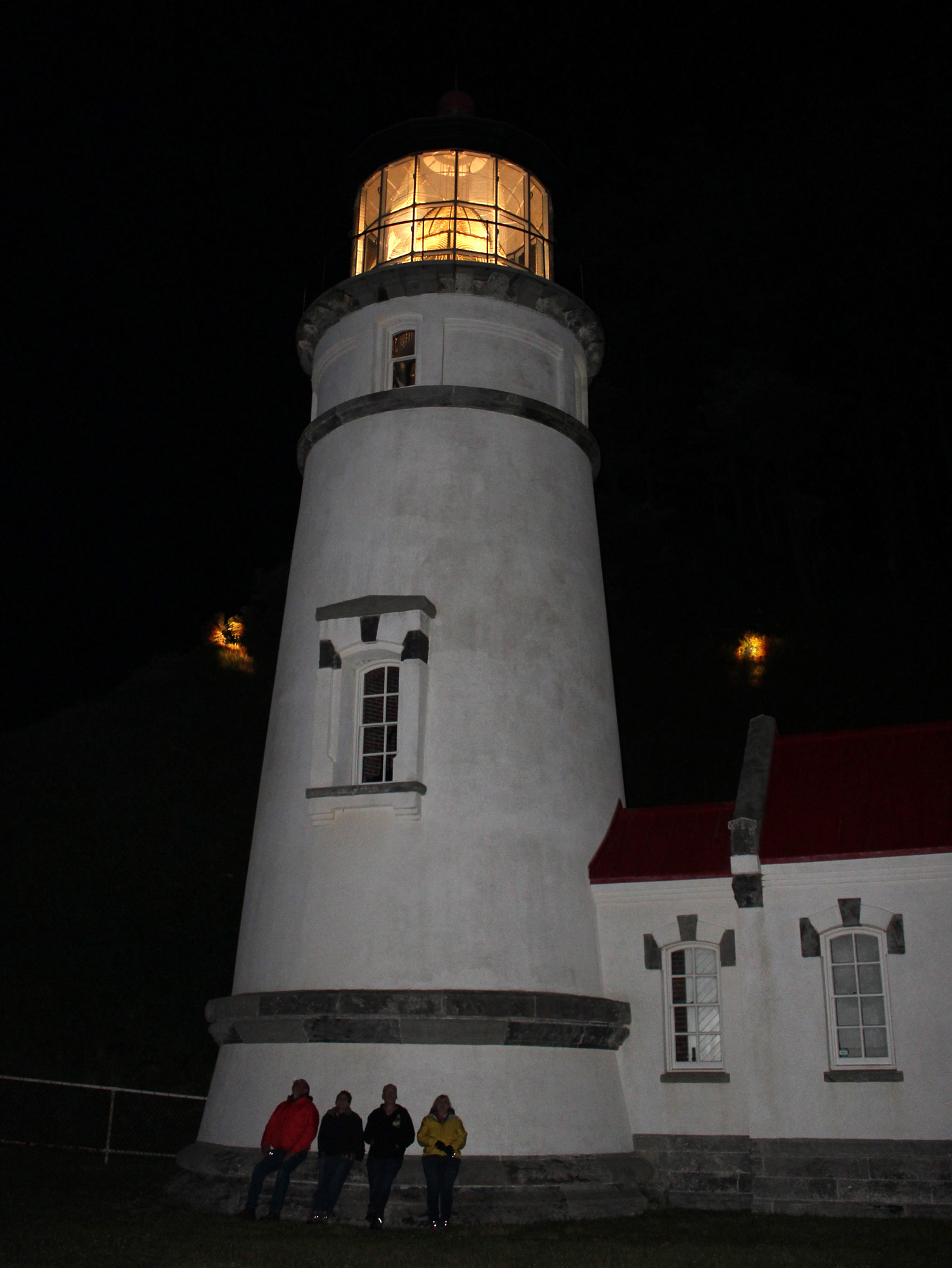 We went back and talked and enjoyed a campfire until we saw that it was fully dark and the stars were out. The five of us drove back to the lighthouse and walked up the path (with flashlights) so we could see the lighthouse at night. One of the volunteers had told Jim to sit right under the lighthouse and look up, which we did, and it was truly magical. We couldn’t really capture it with a picture, but it was like being under a kids crib mobile as the spotlights rotated and the clouds appeared to move. We were expecting to see a single beam of light rotating like at an airport, or a flashing light, but the lens rotates around the light, so you get 8 beams of light that spin and spin and spin. Very cool.