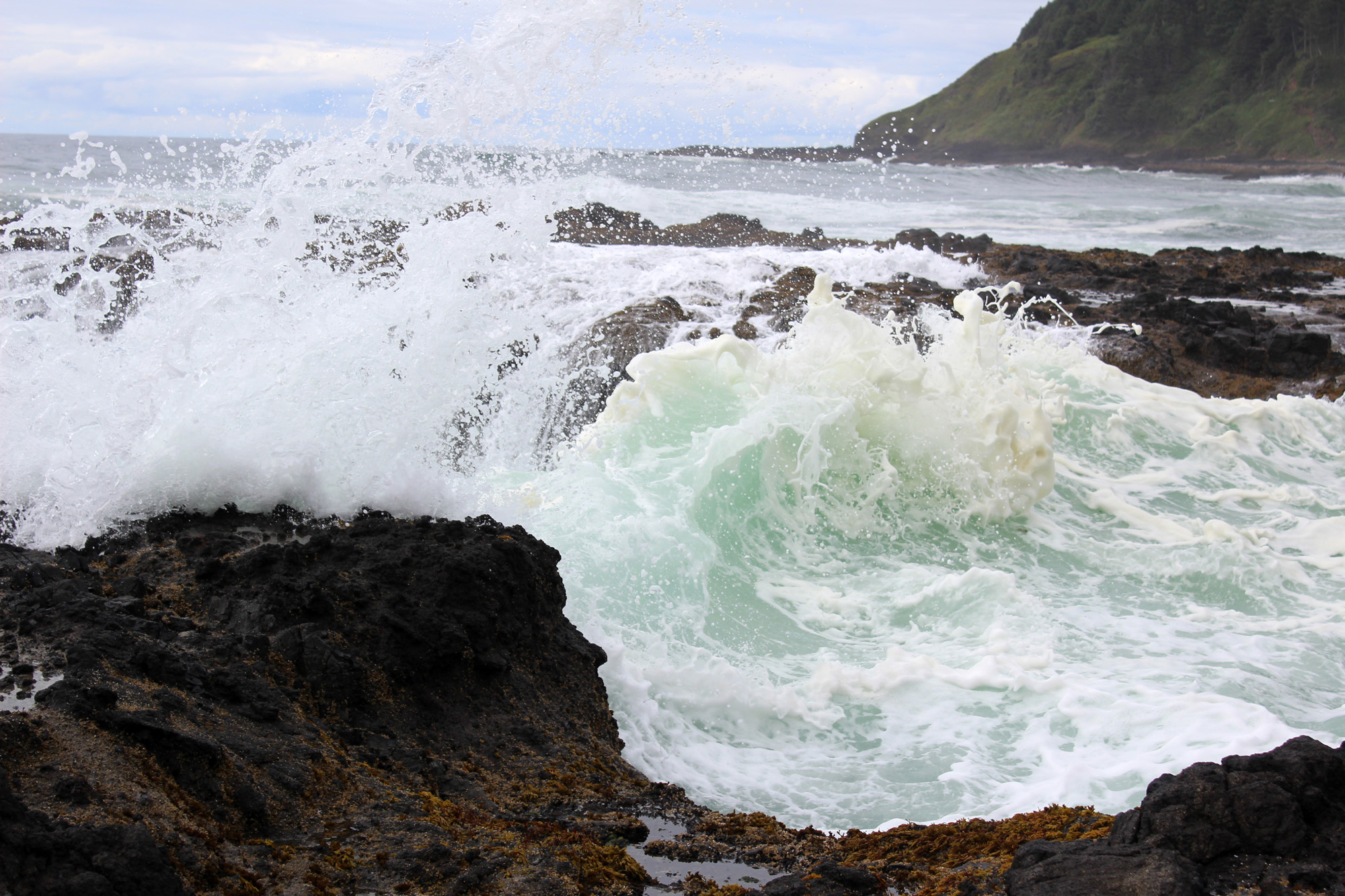 Next we went back to the Cape Perpetua Visitors Center and learned that there were blowholes nearby and it was still high tide. We raced down to the blow holes and had a fantastic time taking pictures of the action. Lee and I could have stayed there all day. Rick headed back to get dinner ready and let Jim and Diana know we would be a little while and we spent a very enjoyable hour exploring the blowholes.