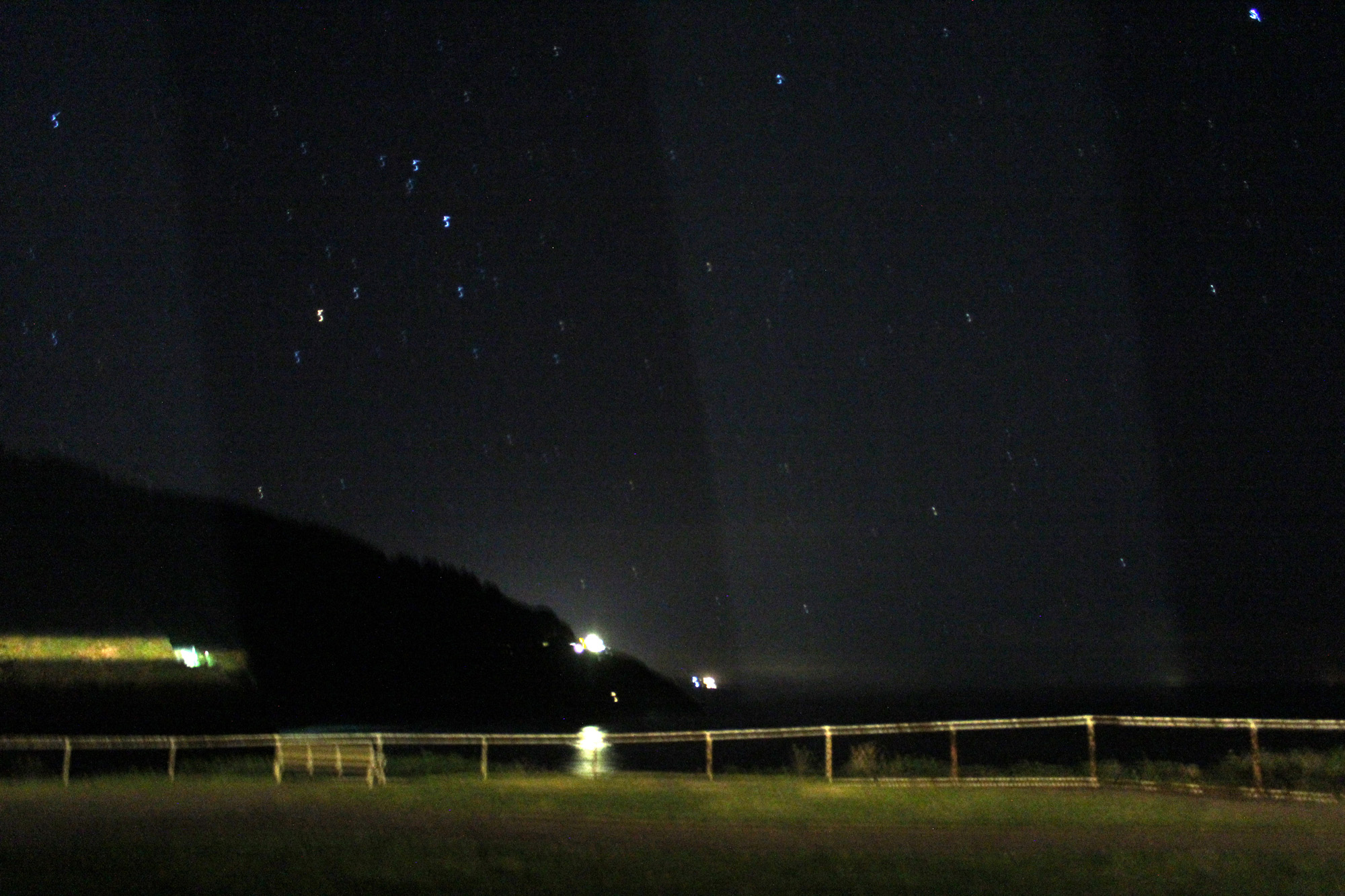 This was as close as Lee could get to what we saw. In order to get any picture at all he had to take a long exposure, so the beams are really wide, but this is showing how far each beam travels in about 4 seconds. In reality the beams were much thinner. The beams are pure bluish white light and they bounced off the mist. You could also see them in rainbow colors when they hit the trees and hill behind the lighthouse.