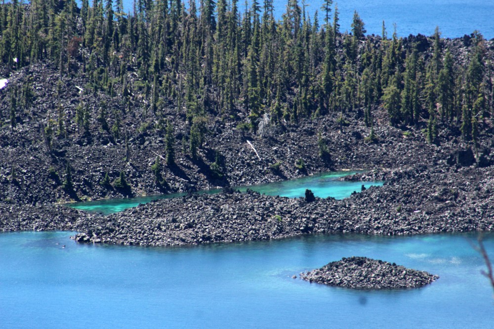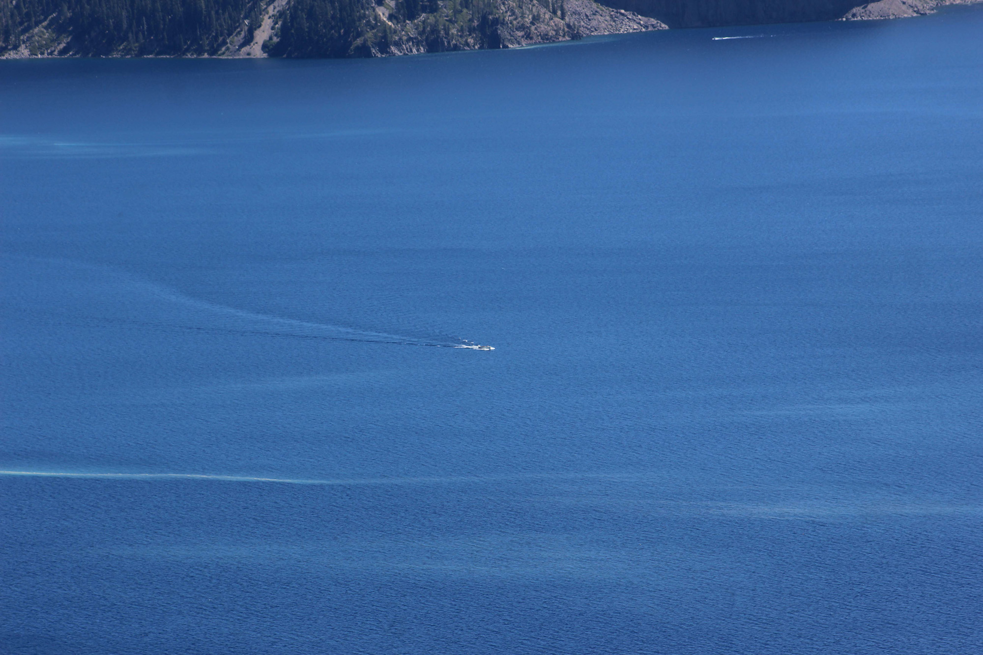 Around 1pm it really started to get crowded and we had made it to Skell Point which was the last place open by car. While we were there two couples who were frequent visitors were pointing and exclaiming, and it turned out that they were looking at the Old Man of the Lake. This is a tree stump that has been bobbing around the lake since at least 1896 and because the lake is so huge sightings of it are incredibly rare. One couple told us they had been coming at least once a year for 15 years and this was the first time they had seen it. Usually I get super excited about stuff like this and I do acknowledge that it was a rare sighting, but to be honest it was a log in the lake and Kat and I were kind of taken aback by their excitement. Lee and Bert got it though and were very into it, so here’s the picture so you know what you are looking for. This was taken with a long lens, so you need to have sharp eyes to catch it. In reality it was just a tiny speck. We were at least 100′ above the water, and it was only visible if you stood in a specific spot. Move to the left or right a few feet and it disappeared behind an outcropping.