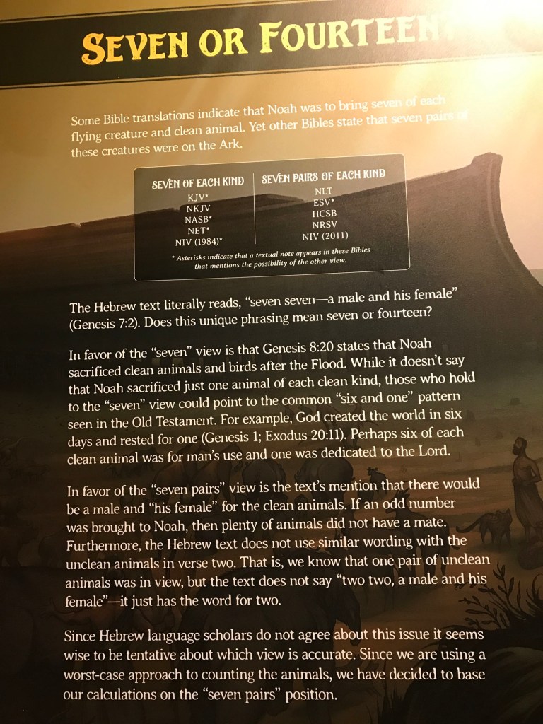 Tons of detail in the presented information, but I grasped the concept pretty quickly. I was more interested in the dinosaurs since I was surprised to see them on the ark as well. The explanation of the dinosaurs had kind’s as well and some of the animals that Noah brought on the ark have become extinct.