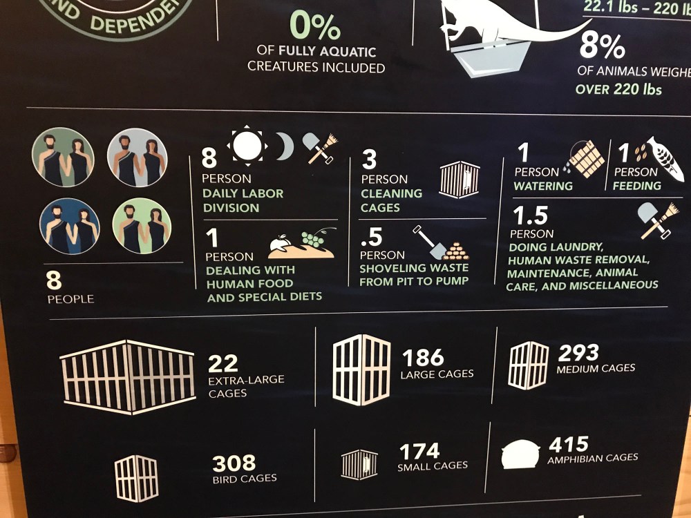 The first and second floors were mainly animal pens and the construction was very interesting. Different types of pens for different types of animals and food, water, and waste solutions for each kind. It was obvious that an incredible amount of thought had gone into how you would transport this many animals and I found all of that pretty interesting. They also had calculations showing how they thought 8 people could manage the workload and the amount of food, water, and oil that would have needed to be stored.