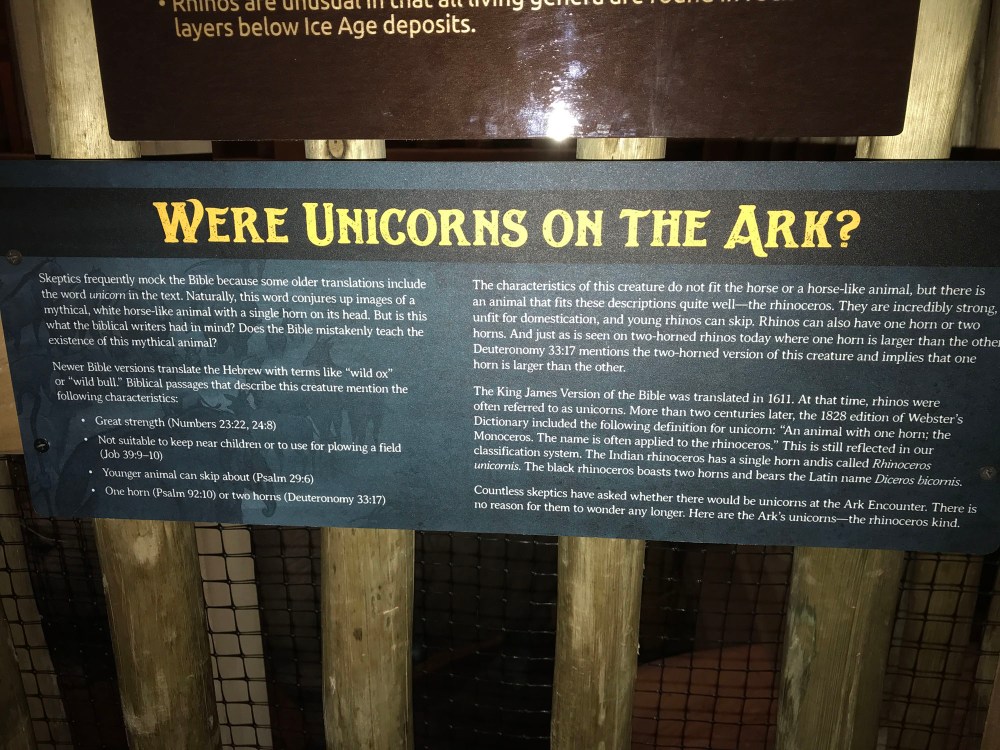 They even covered Unicorns on the ark and their belief is that unicorns were actually rhinoceros. DeDe and I were particularly interested in this. She had heard as a child that the unicorns were playing and wouldn’t get on the boat and I had heard Noah was mad at them, but either way it’s probably true that unicorns were rhinos…which is a bummer because the world would be a better place with a few unicorns in it. 🙂