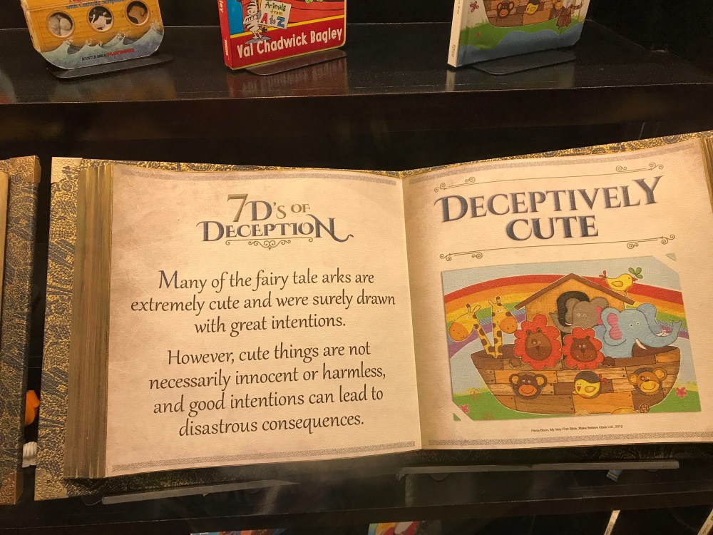 Speaking of childhood stories, there was a side section that had lots of cartoon animals on it. I went inside expecting to see a kids area, but instead found a section on why childhood ark images are dangerous. There were several examples of childhood arc images and they talked about the 7 D’s of Deception which “attack the truthfulness of scripture.”