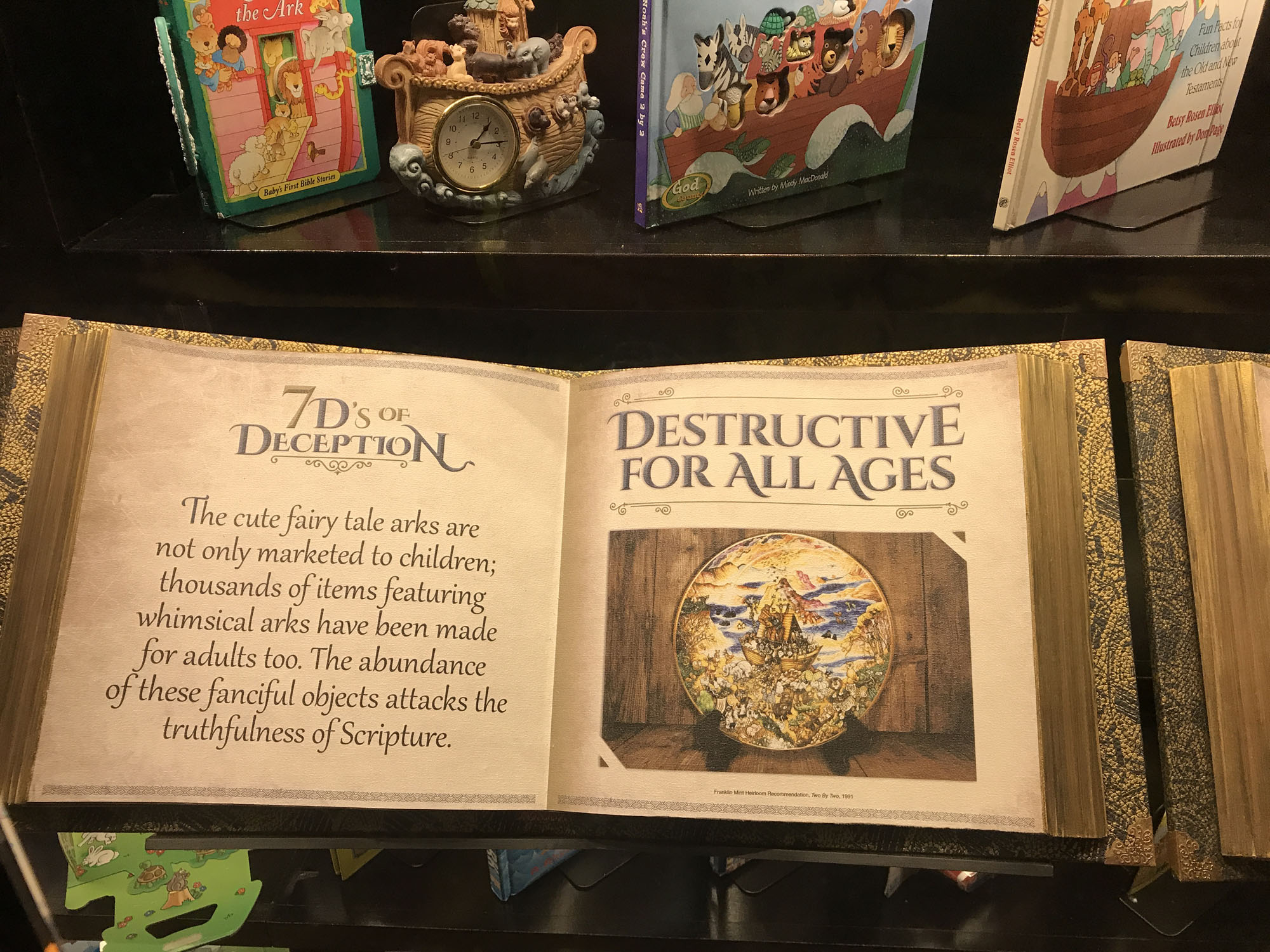 Speaking of childhood stories, there was a side section that had lots of cartoon animals on it. I went inside expecting to see a kids area, but instead found a section on why childhood ark images are dangerous. There were several examples of childhood arc images and they talked about the 7 D’s of Deception which “attack the truthfulness of scripture.”