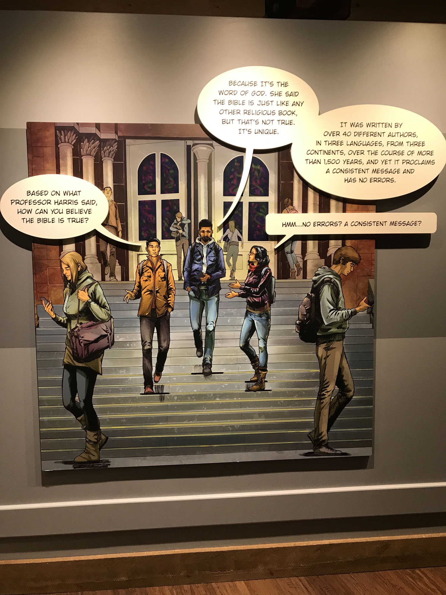 The third floor had many more side rooms including one explaining that there had only been one Ice Age and a series of life-sized cartoon panels showing a college aged student struggling with their faith. The most interesting one for me was a series of booths showing how the bible had made its way around the world in written format and the exhibits ended with a large panel talking about how we know the bible is true.