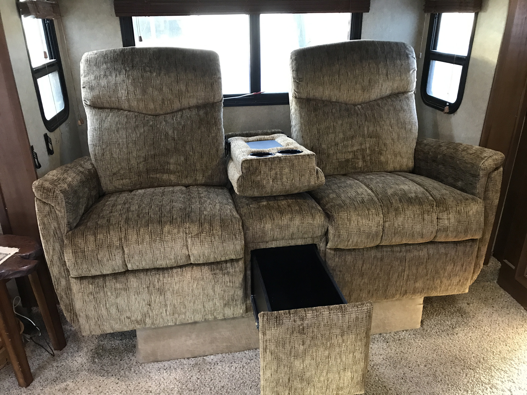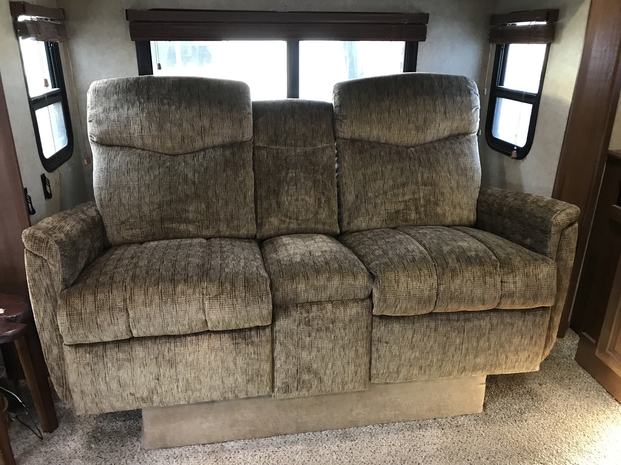 When we arrived at Dayton freight they didn’t quite know what to do with us. Ultimately they used a forklift and loaded the pallet into our truck, which had a giant cardboard box strapped to it. Lee then ratchet strapped the pallet to the truck since it was too long for us to close the tailgate. I was nervous driving back, but we had no issues and ultimately we arrived at the campground. There was really nothing wrong with our original couch and we weren’t sure what to do with it, so we asked the owner of the campground if she would like it for her rec room. Thankfully she was glad to take it, so we dissembled the love seat (to get it out the door) and place it outside. Then Bill came over and helped us move the new couch into the RV, which was a little tough because it actually came in three pieces.